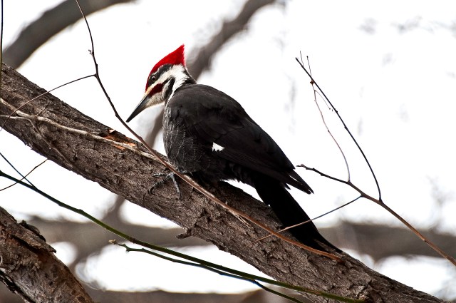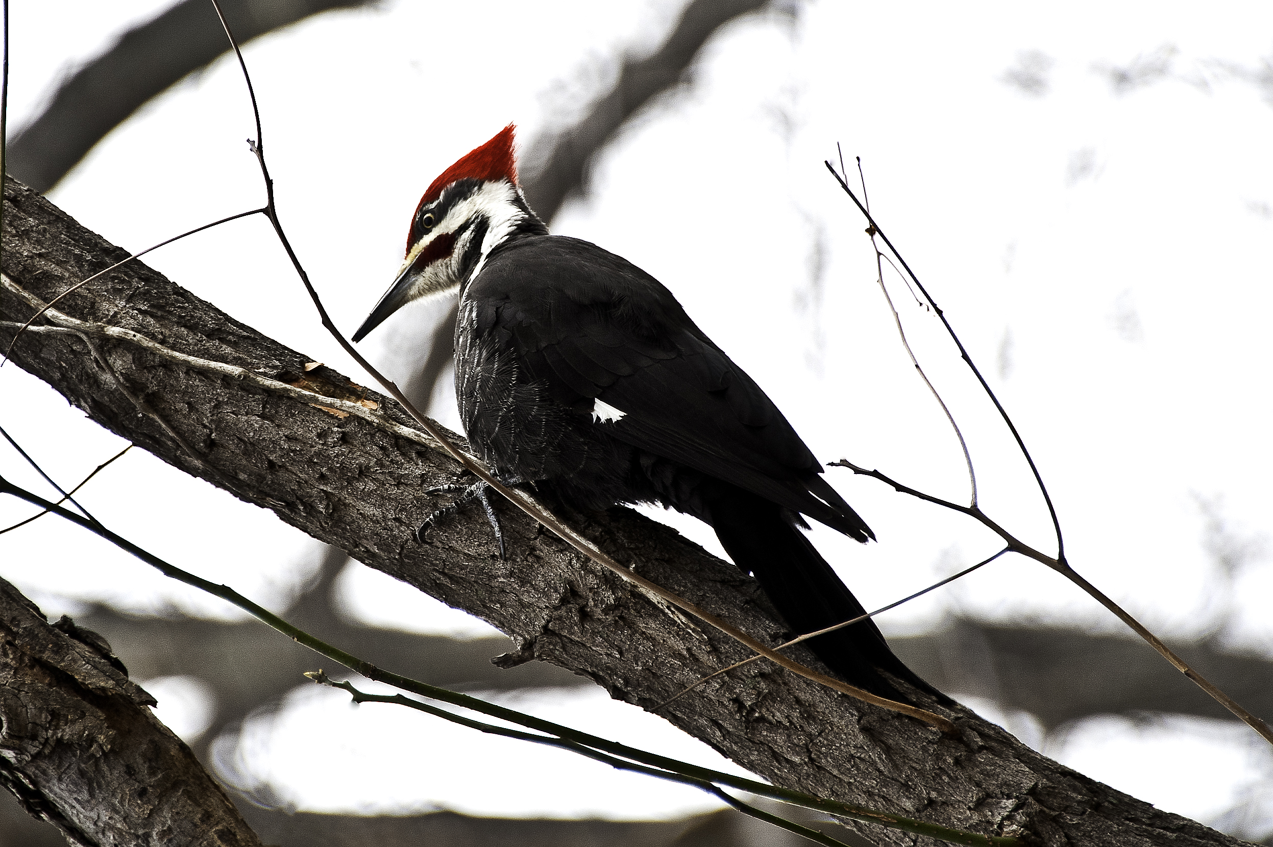 I have been wanting to capture an image of a pileated woodpecker for a long time, and in about a two week period, I managed to do that twice. Usually, you can hear them pounding away on a tree, but not see them. Today was an exception to that, and I was able to get a very good image using my 28-300mm handheld. I did not have time to breakout the tripod and longer lens. I stopped just after the CSX trestle, turned on my flashers, and ran around behind the car to get my camera, adjust, and shoot a few times. Fortunately, it was a very quiet morning and nobody came from around the bend. No bass tournaments. Peaceful.