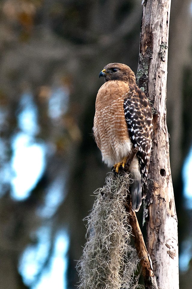 This evening after preparing the gear for tomorrow morning, I was reviewing images from my December visit to Gainesville, FL and found one of the sunset on Lake Wauburg that I had not processed–so I processed it (below). It reminded me of that incredibly beautiful sunset and how lucky I was to be there to witness and capture it. I was on the lake with JulieAnne and Ivor. They could not have arranged for a better photography experience. Besides the sunset from the water, we saw numerous birds to include herons, egrets, cormorants, white pelicans, eagles, and a night heron, anhinga and red shoulder hawk that posed perfectly for me. One of the sunset photos follows and one of the hawk. The others are located at: http://stabone.com/p396945010