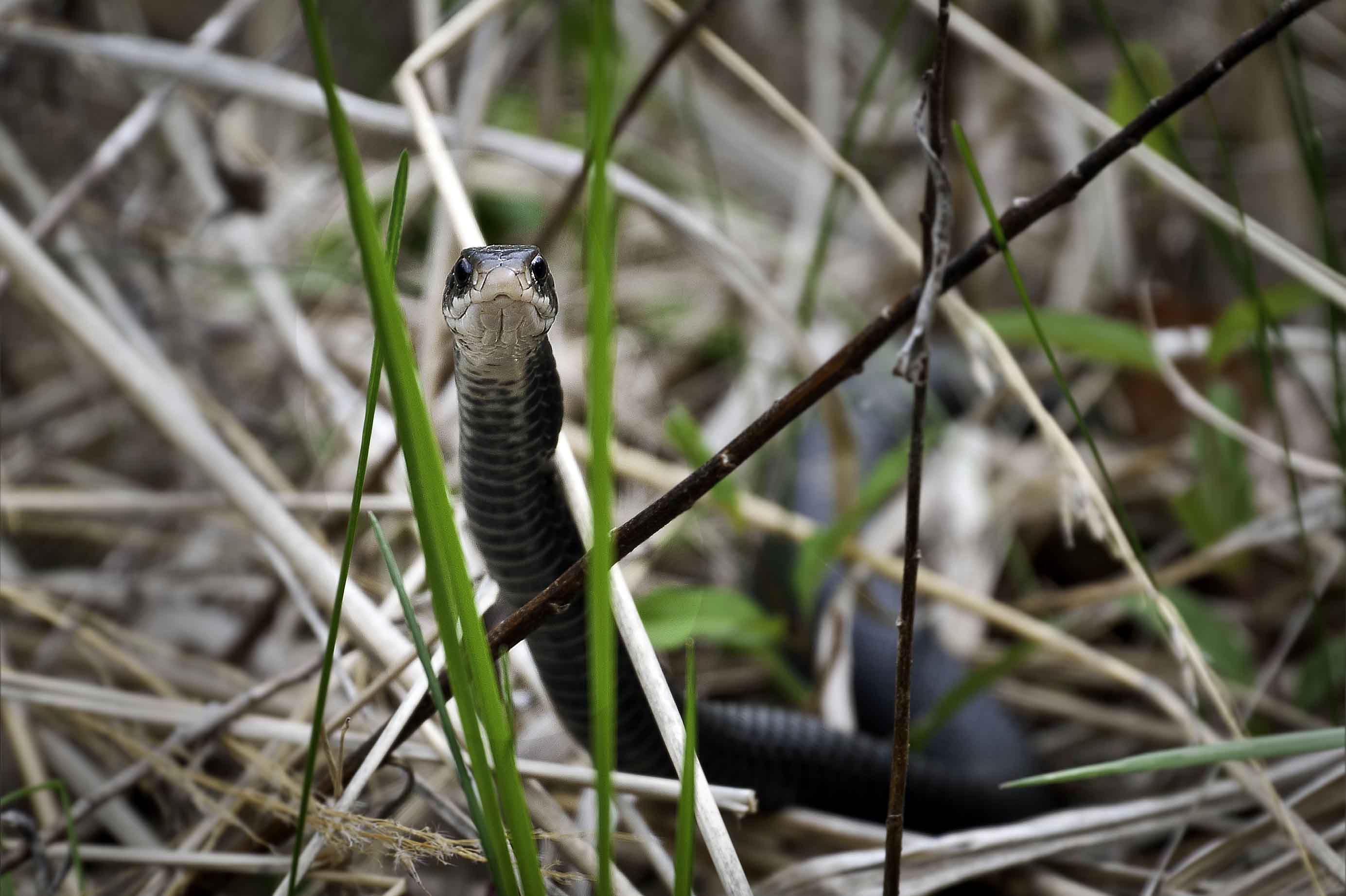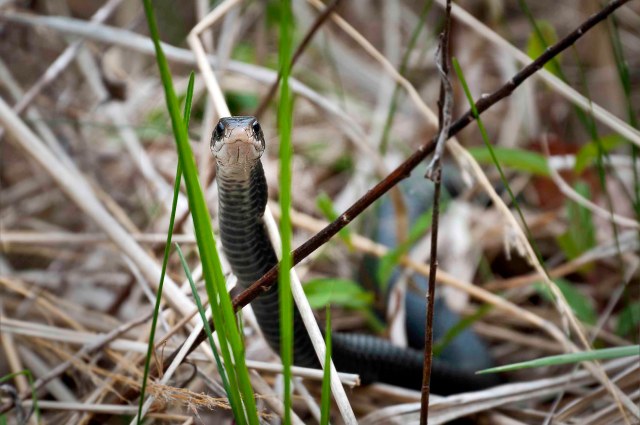 Below is a young black rat snake that we saw on the trail. It was not moving and very still while watching us as we looked at it.  Then, as I moved to get a side shot, it sped off through grass.