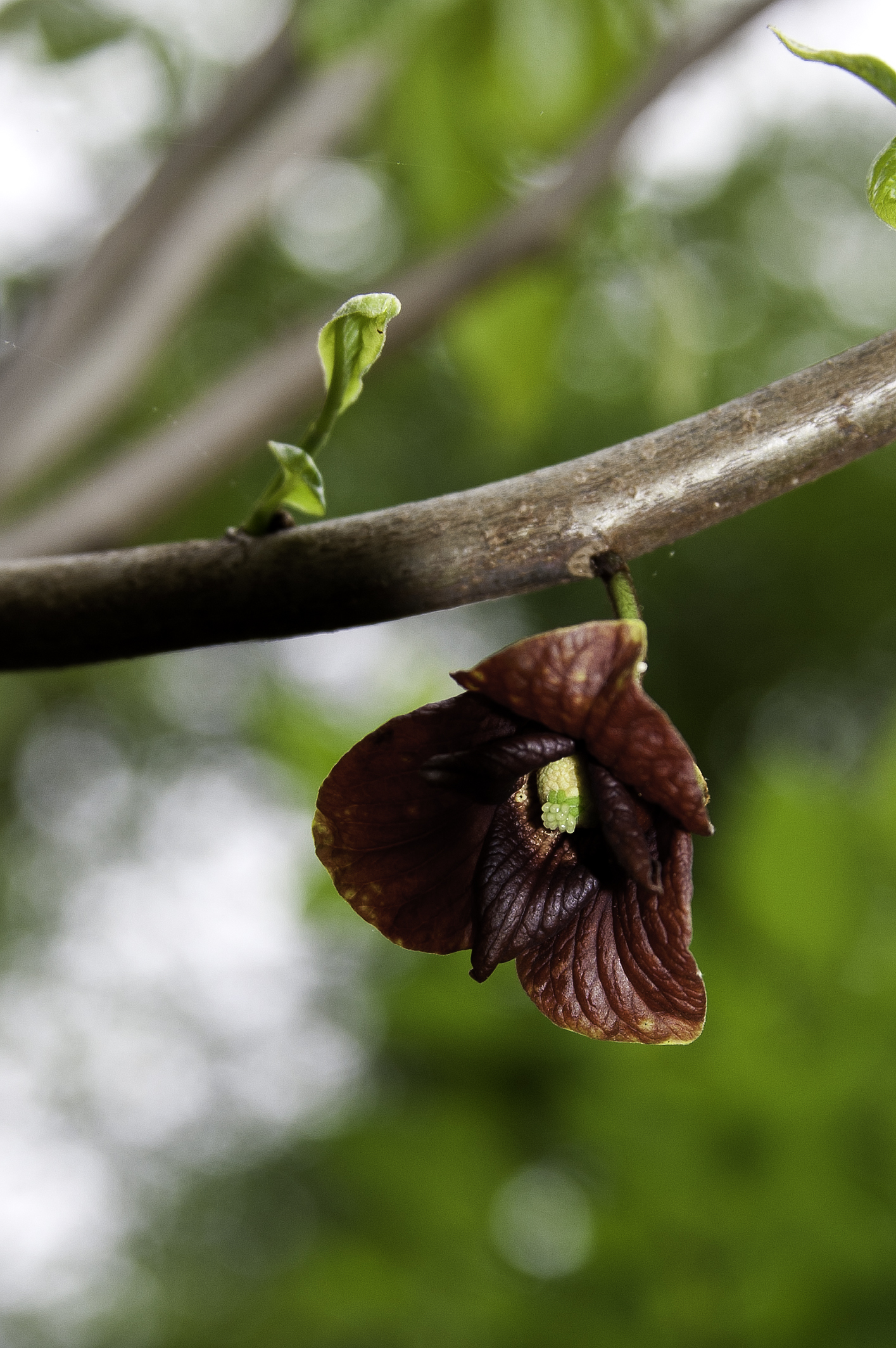 We have walked through Leesylvania many, many times and have often seen pawpaw trees and their pawpaw fruit late each summer, but we have never seen until this weekend the pawpaw tree flowers that bear the fruit.  The fetid flowers are unusually shaped and a deep maroon, purplish color (65mm, f5.6, 1/200, ISO 200).