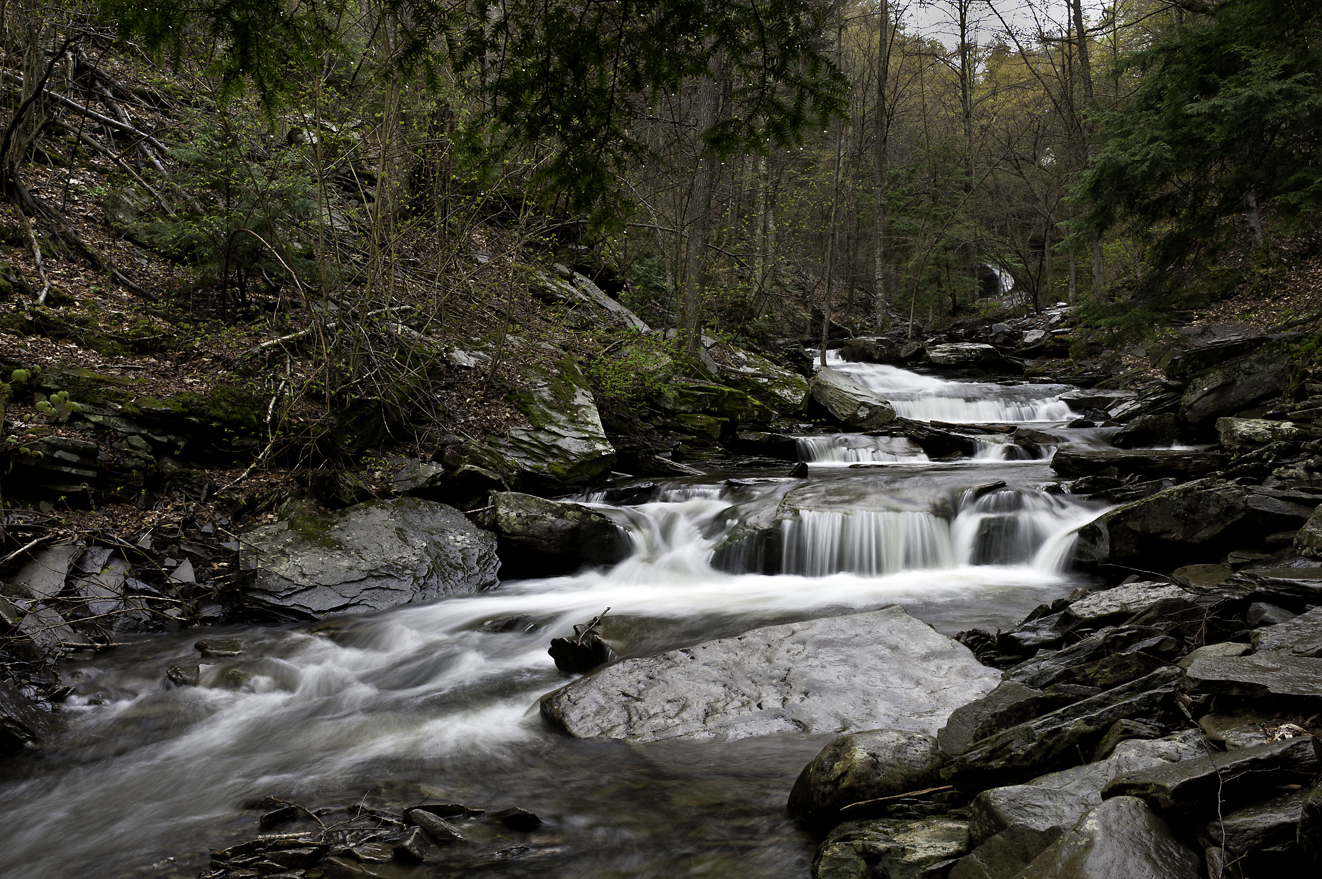 Ricketts Glen waterfalls range in height from 94 feet to one at 11 feet. In between the waterfalls, Kitchen Creek runs rapidly over rocks and boulders making numerous small (unnamed) waterfalls.  There was new, bright green plant life starting to grow everywhere. The forest was exploding in green, and the sound of the fast running creek and falls was very load at times. When it was quiet between the falls, there were birds singing everywhere.  It was awesome to see, hear and shoot.
