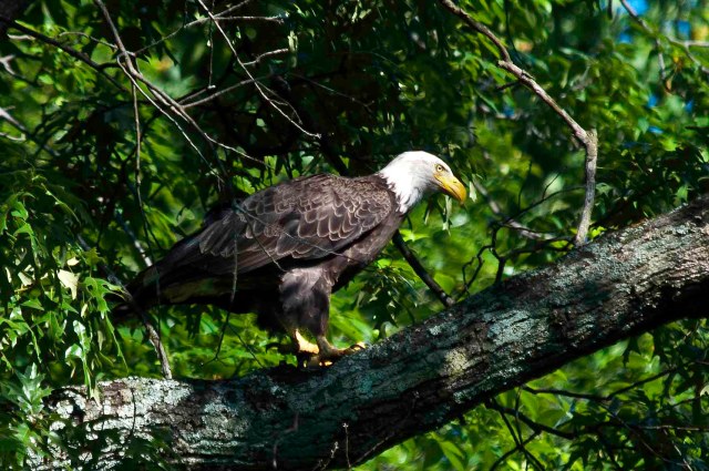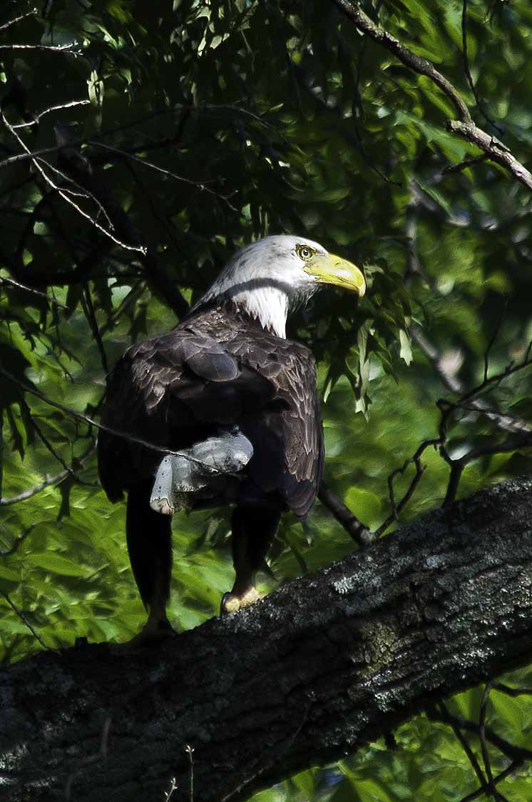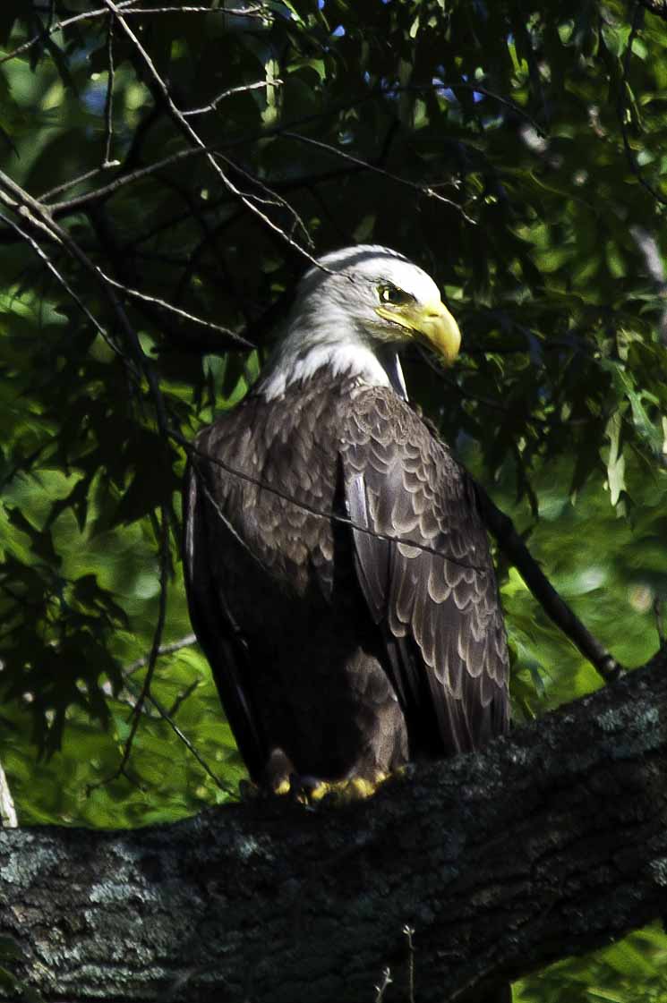 When I was leaving the park, I noticed what looked like an eagle’s white head high up in a distant tree. It was difficult to see through a series of trees, but as I slowed the car down to a spot where I could get I better view, I could see that it was in fact an eagle and in a location where I might be able to photograph it. I did a quick (illegal) u-turn, parked the car (poorly in my haste), grabbed my camera, and began shooting. The eagle saw me and all the commotion I was making, and I could see that it was getting nervous listening to the camera fire away. It stayed long enough for me to get a few good photographs. (D300, 400mm, f/5.6, 1/250, ISO 200)