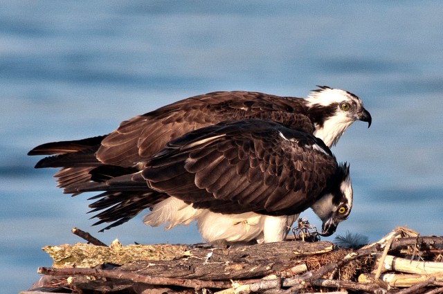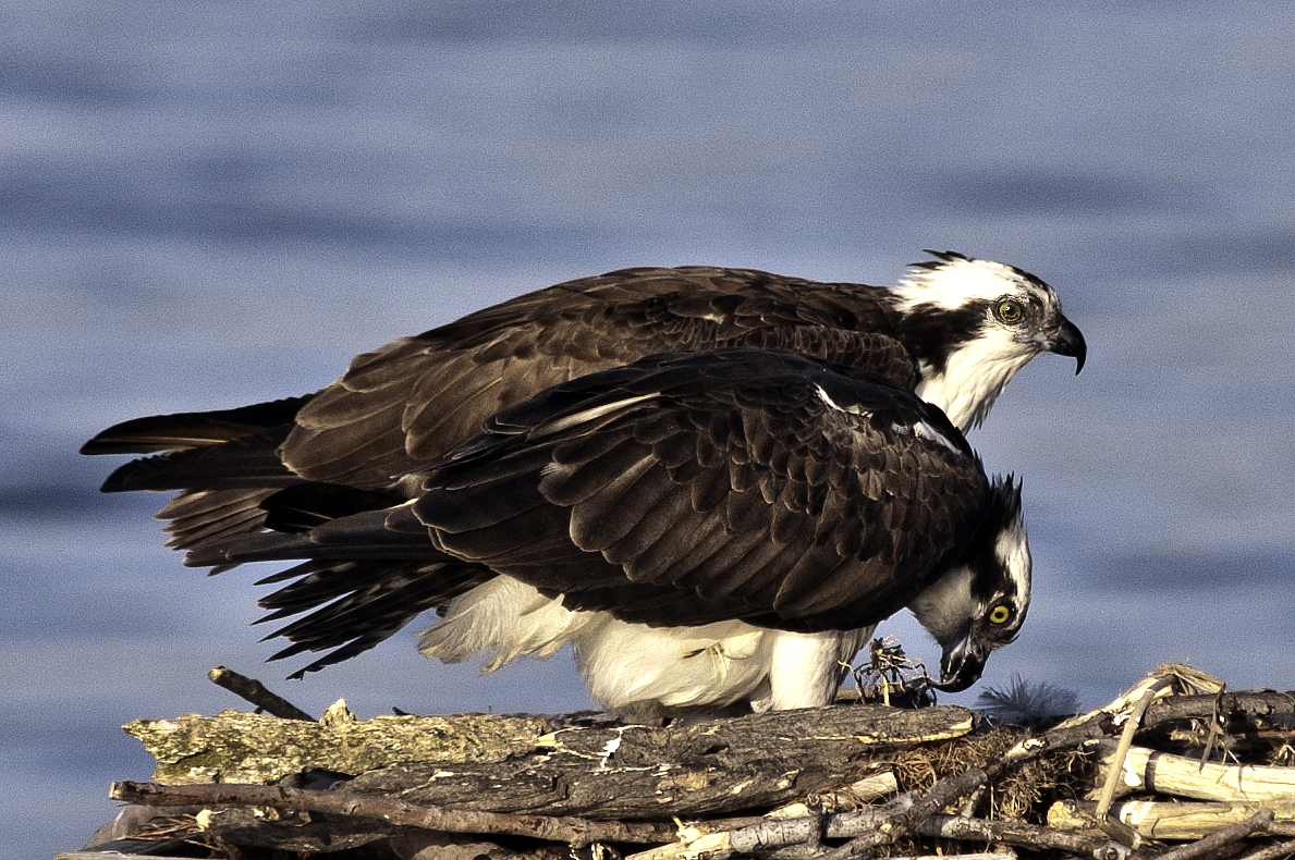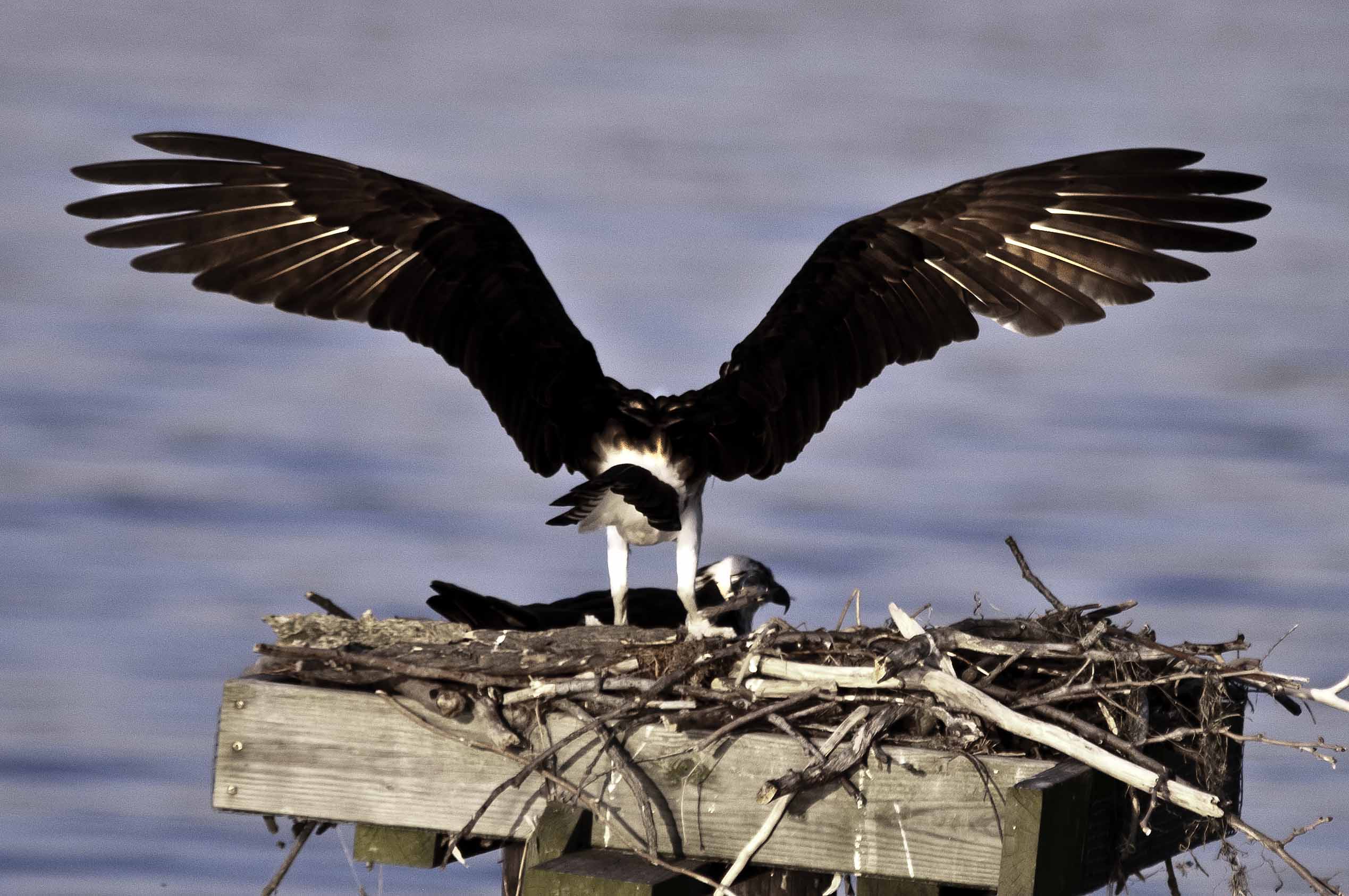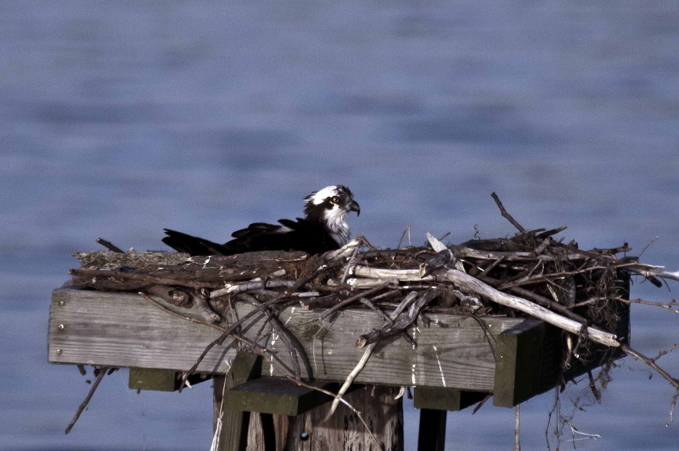 Later, after the sun had risen, I walked out on a pier at the park that provides a good view of a pair of ospreys that return each year to rebuild their nest and raise their young. The female osprey was on the nest when I arrived, obviously sitting on eggs. Later, the male returned to the nest with the tail section of a fish. A couple photos of the ospreys follow (D300, 400mm, f/8, ISO 200). I plan to photograph the osprey chicks during the summer, as I have done in previous years.