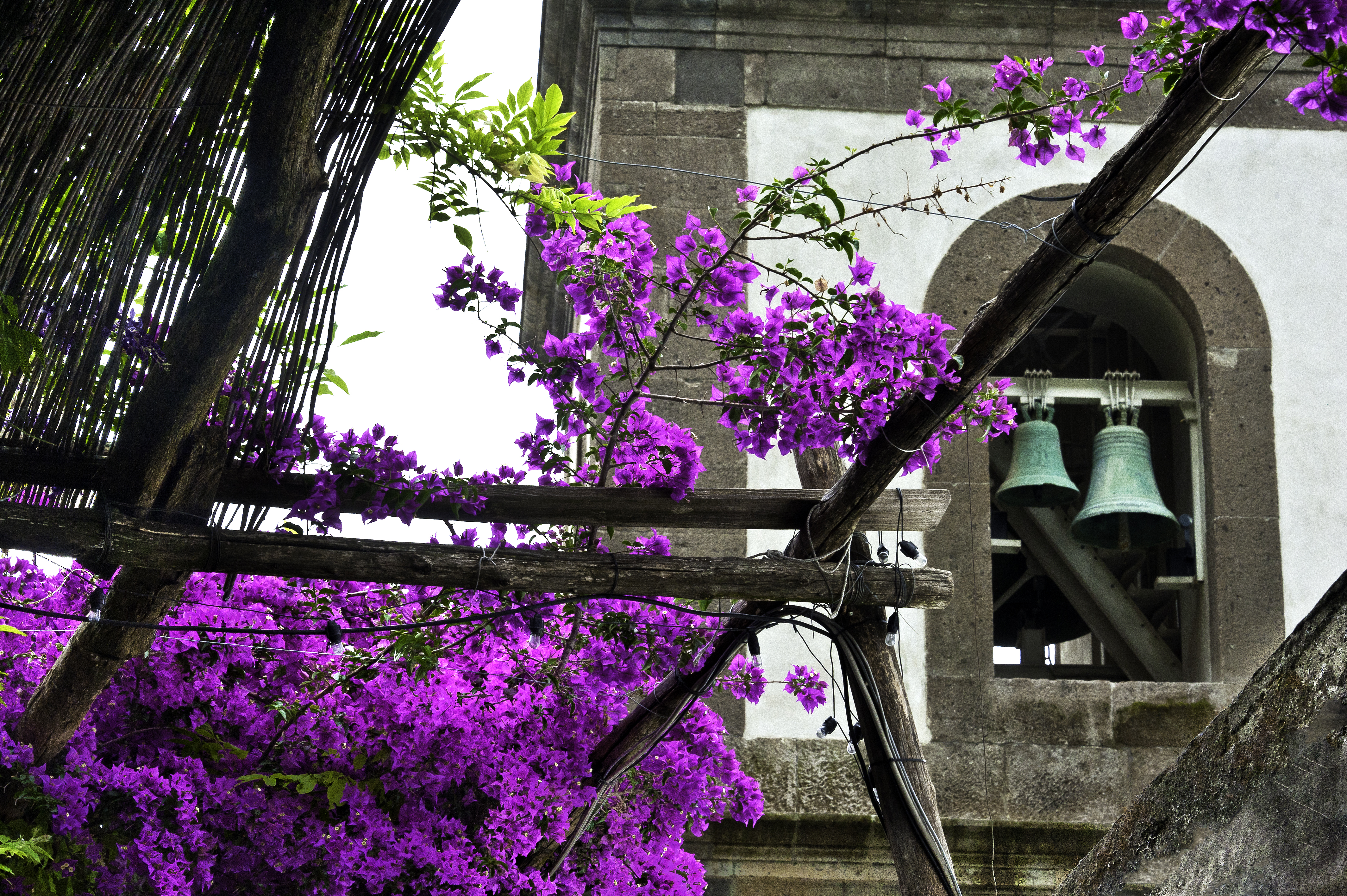 As we walked down the narrow streets, many were covered in vines and flowers such as the one below, which caught my eye because I could see the bells of a church bell tower through the opening above. The contrast in colors was spectacular against the otherwise cloudy, grey sky and white of the church.