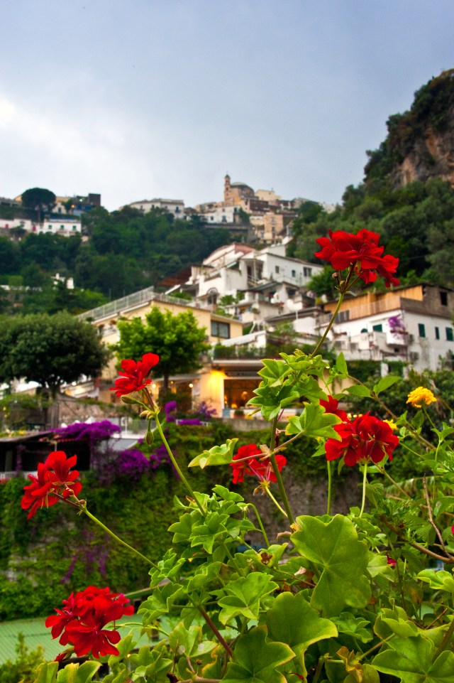 Flowers were everywhere and added to the beauty. The below image highlights some of the many flowers, in this instance geraniums in the foreground with some of Positano in the background.