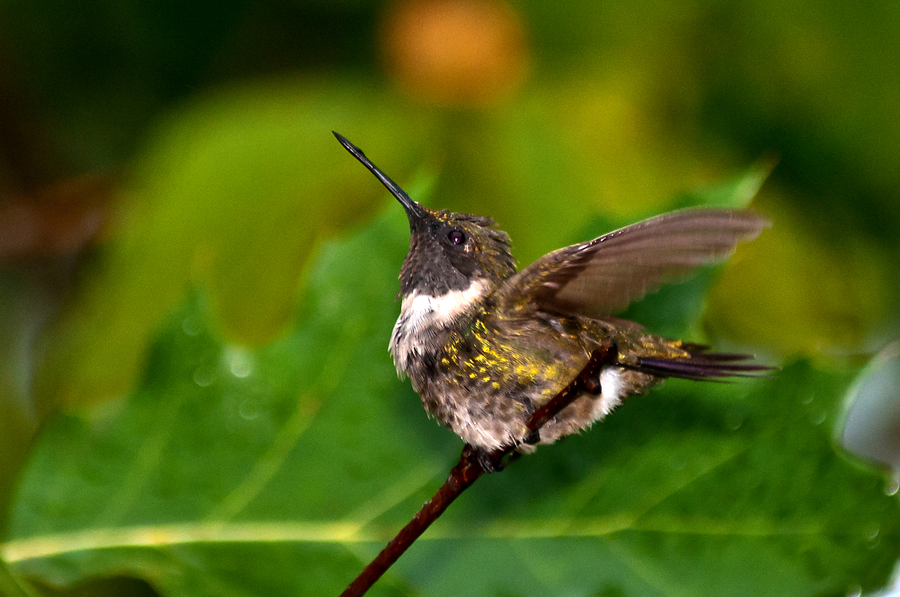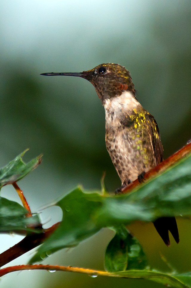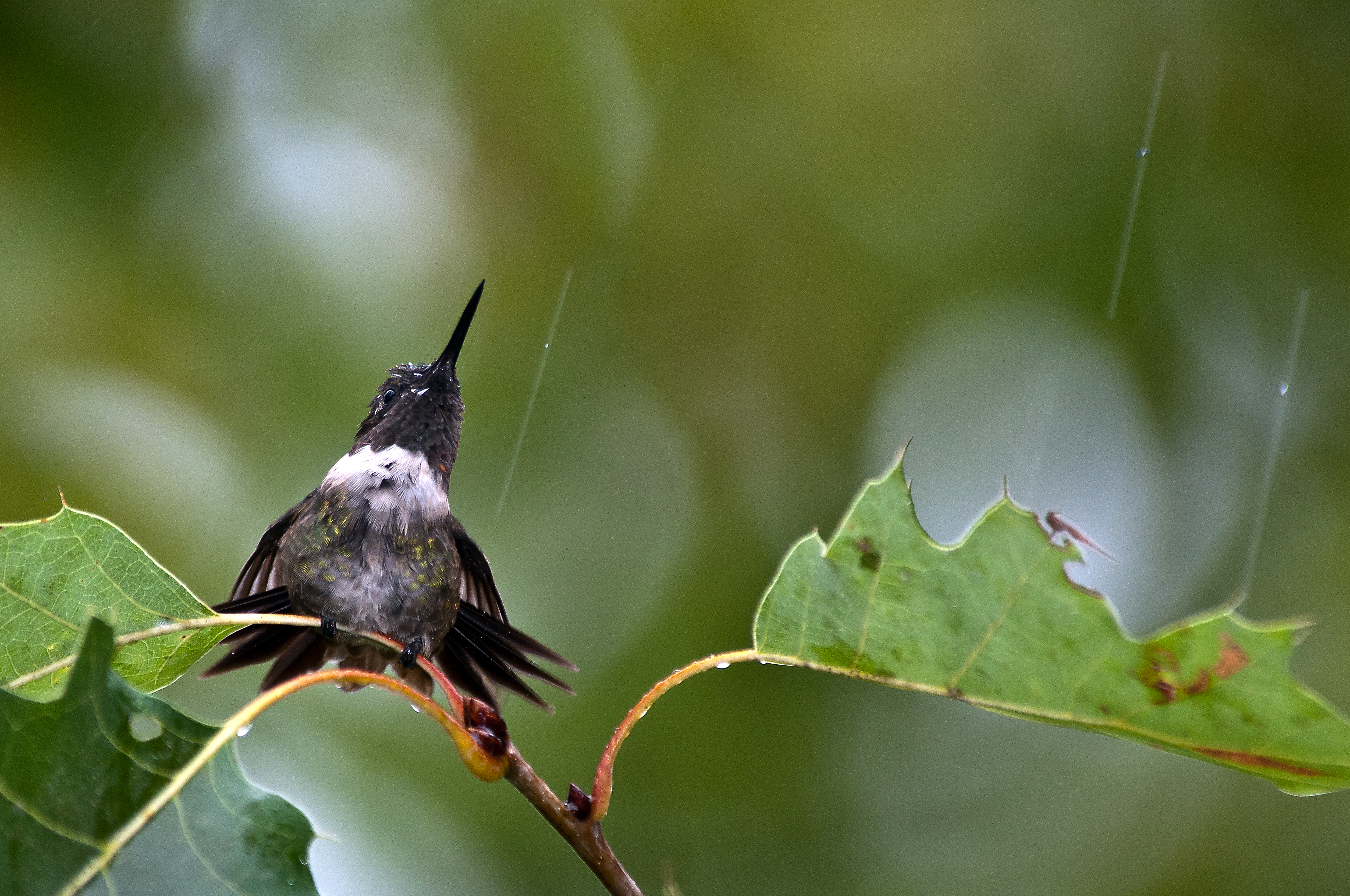 In the above image, you can see rain drops falling while the male Ruby-throatded Hummingbird shook off some of the rain. Notice how his head and beak are parallel to the falling rain. That’s not a coincidence. This hummingbird, and the others, were constantly looking directly into the falling rain.