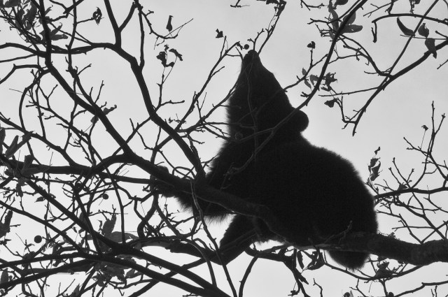 The next image zooms in on the bear’s silhouette as it worked its way toward an acorn. Notice what is just above the bear’s nose, and how it was balancing precariously on the branch.
