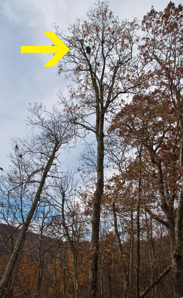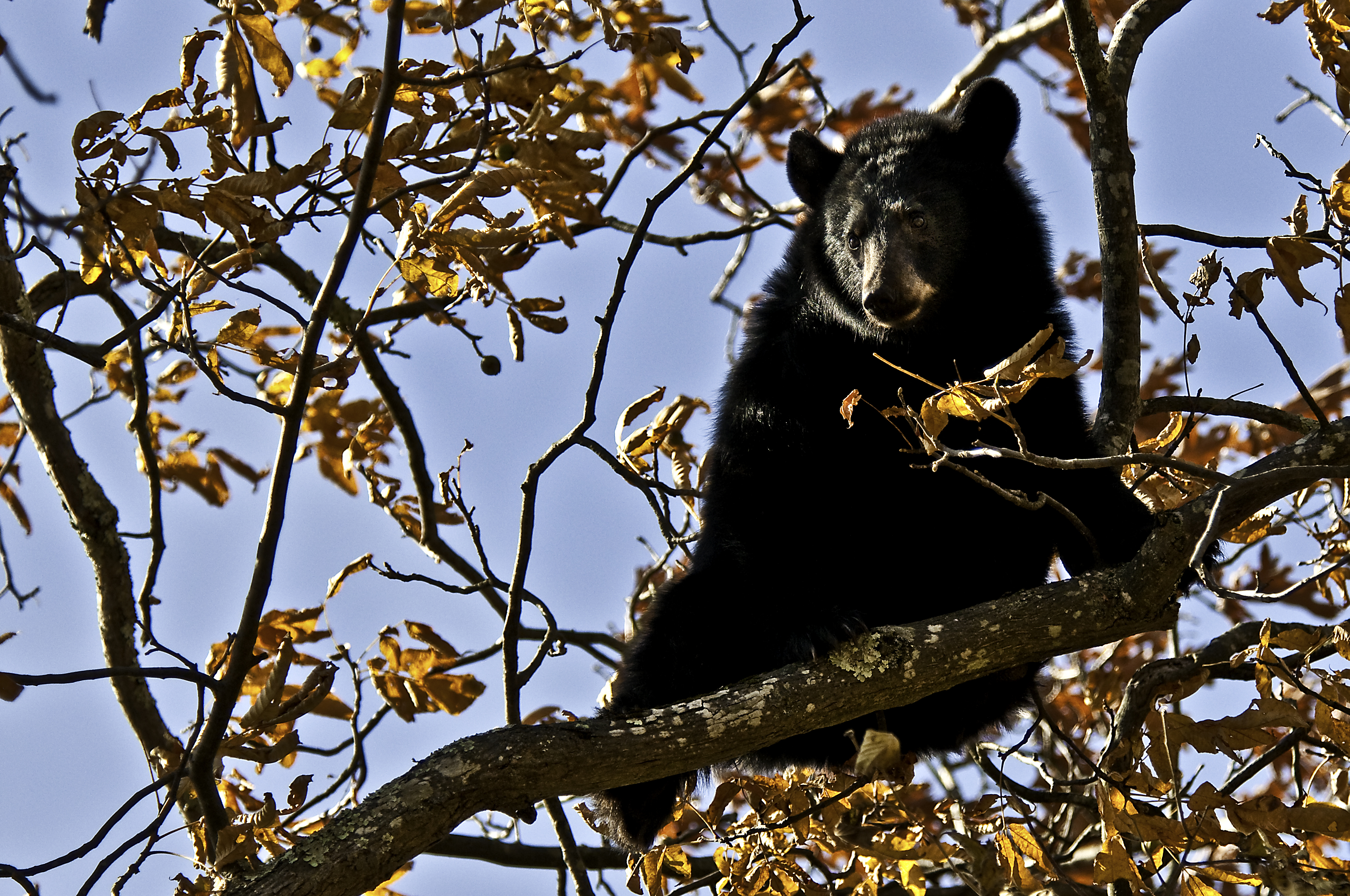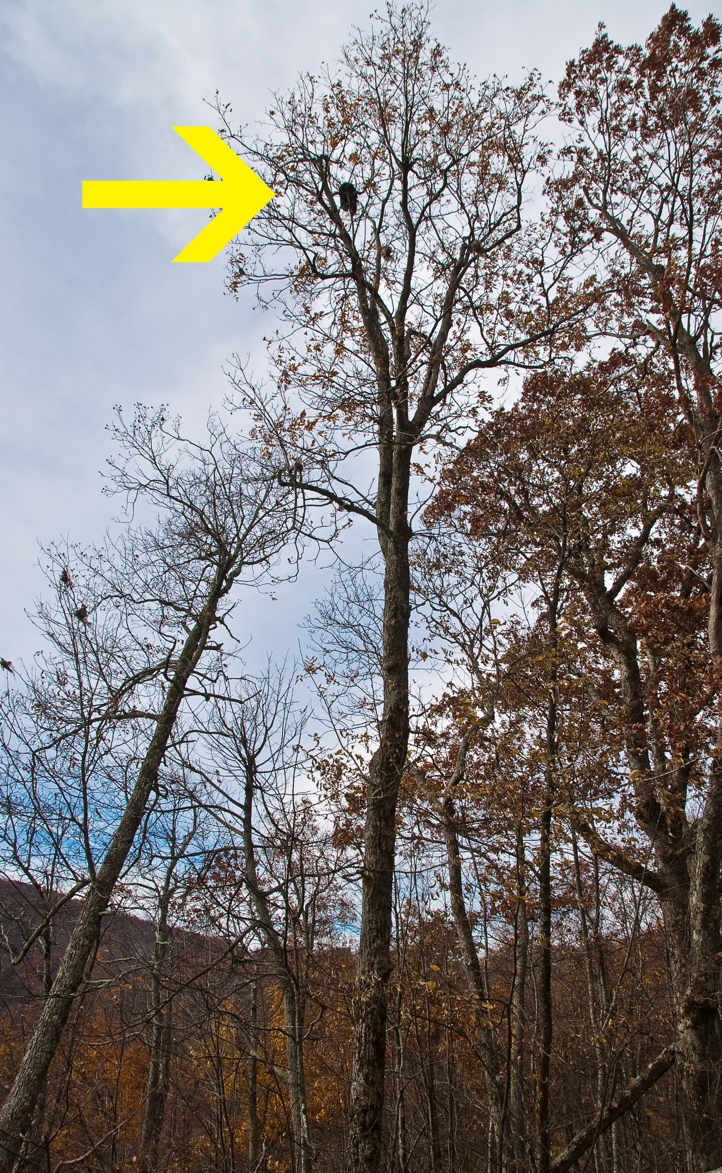 Last fall, while in Shenandoah National Park, I photographed a black bear 50 feet or more up in an oak tree. The bear was searching through the tree for acorns. It was amazing how high up in the tree the bear went for acorns, and there were not many acorns in the tree to be found. The below photo shows (arrow pointing at the bear) how high up in the tree the bear was located.