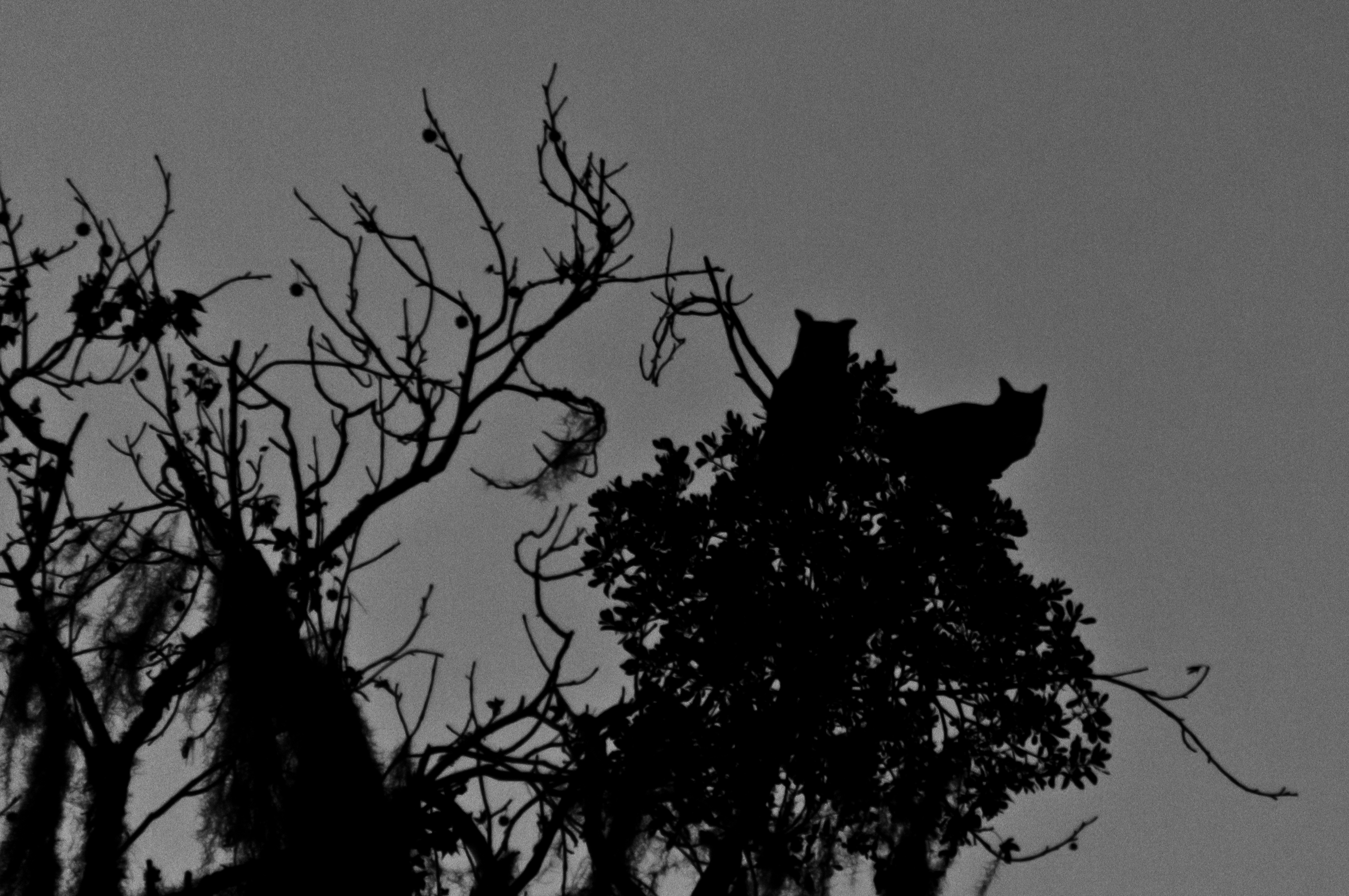 Just before leaving the lake, we heard and spotted a couple of Great Horned Owls. It was too dark to photograph them from the ganoe, but I was able to get their profiles against the evening sky, as they looked curiously at us.