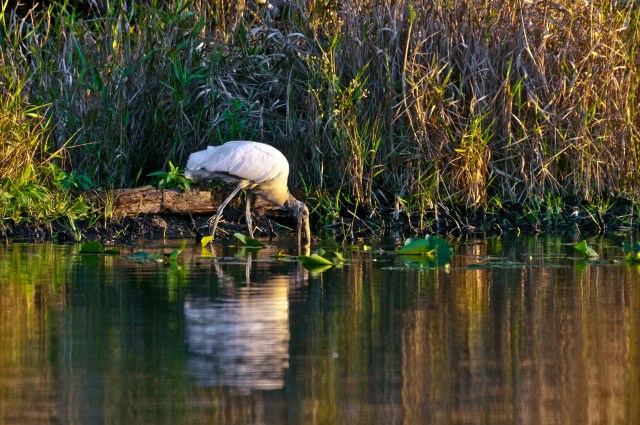 Above a Wood Stork was working the shoreline for food in the golden light.