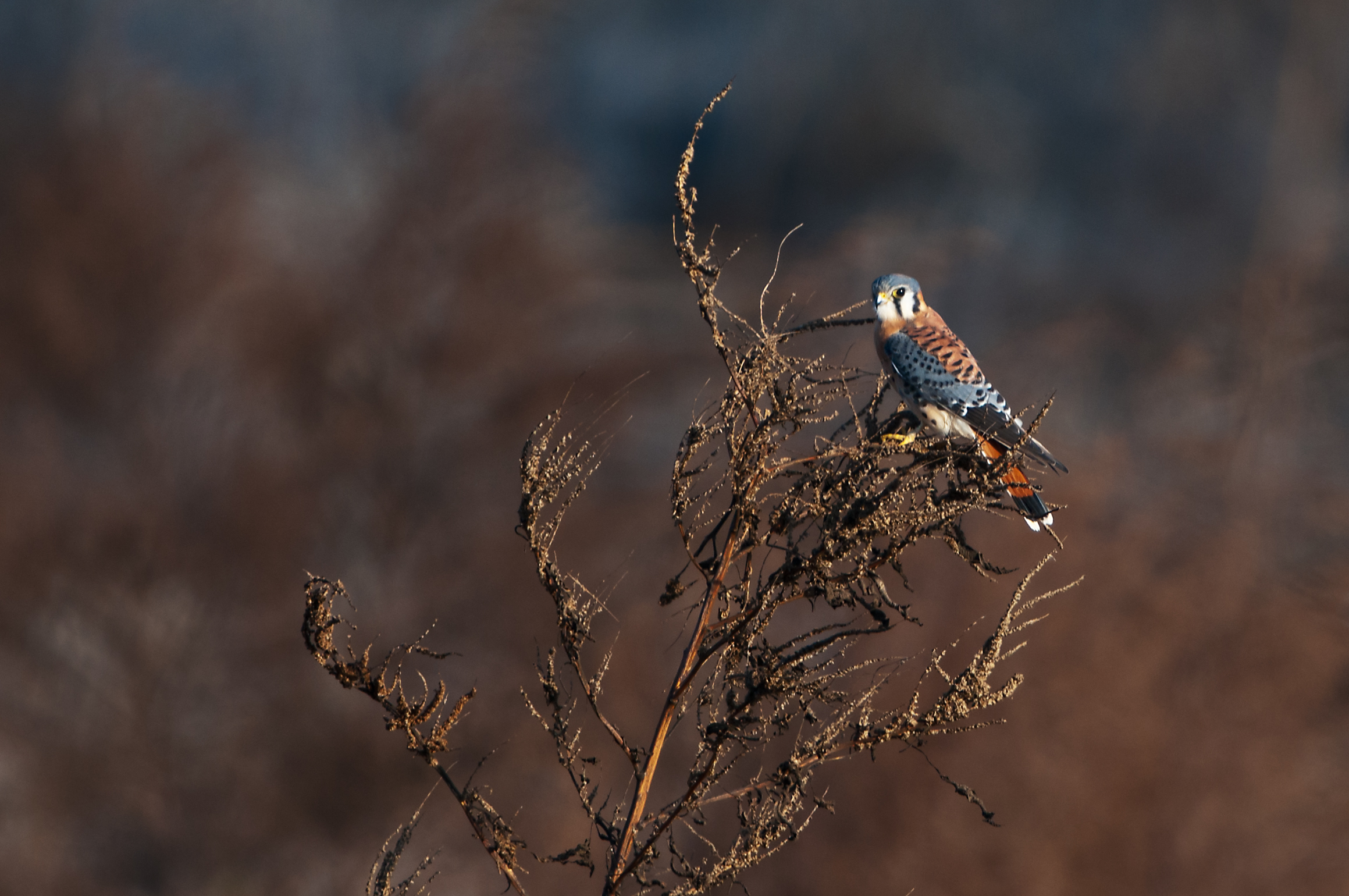 Below is an American Kestrel. I could have cropped this image down to show more of the Kestrel, but I love the background, its colors and 3D effect, and also like how the background colors compliment those of the Kestrel. And of course, the afternoon sunlight was beautiful on the Armaranth plant where the Kestrel was perched. Kestrels are falcons and are easily identified by their hunting behavior, which is to hover at a height of around 30–60 ft over open country and swoop down on prey, usually small mammals, lizards or large insects. This Kestrel dove to the ground and then flew up into the Armaranth (without a catch), where it posed for me.