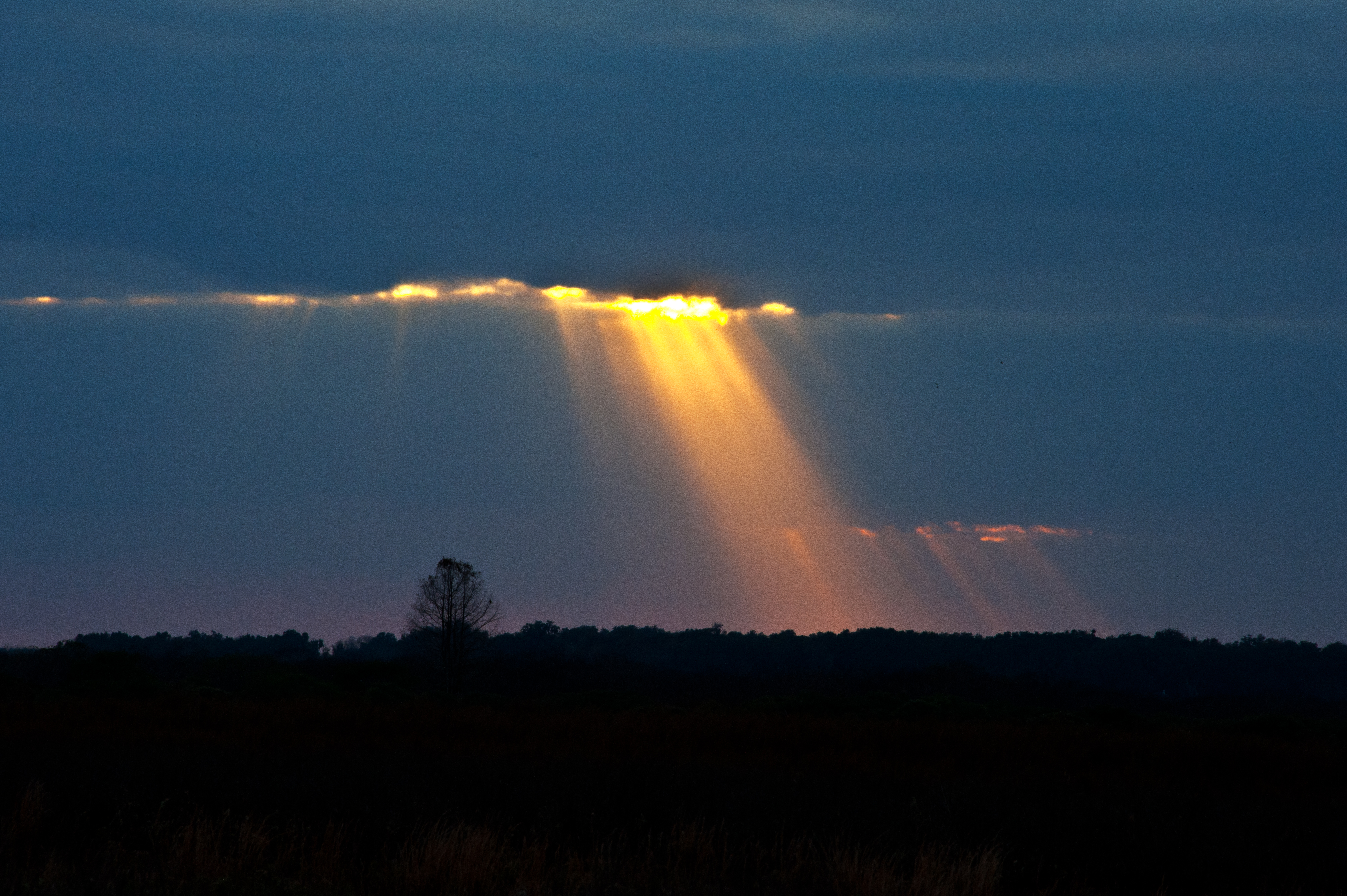As I was leaving the Prairie, the sun was setting, and after locating an unobstructed view, I stopped to watch and photograph the sunset. This sunset was not one of the spectacular ones, but it was a bit unusual because of openings in the heavy dark clouds that allowed the sun’s golden light to streak down to the ground.