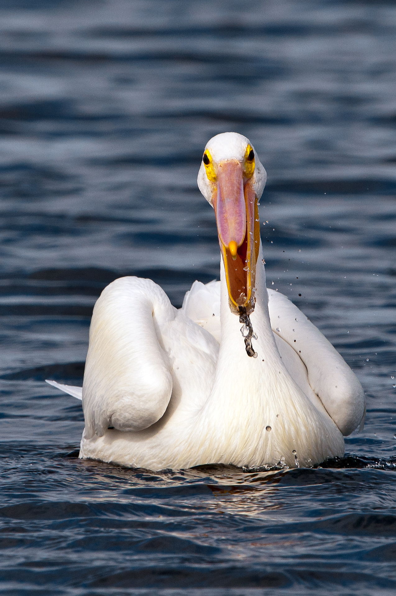 I enjoyed watching and photographing them as they swam around the pond looking for fish. However, I do not think they located any fish, because I did not see them feeding, and that could be why they did not stay on the pond very long. Below is an image of one of the pelicans that came up empty handed, or would it be more appropriate to say empty billed.