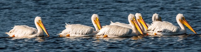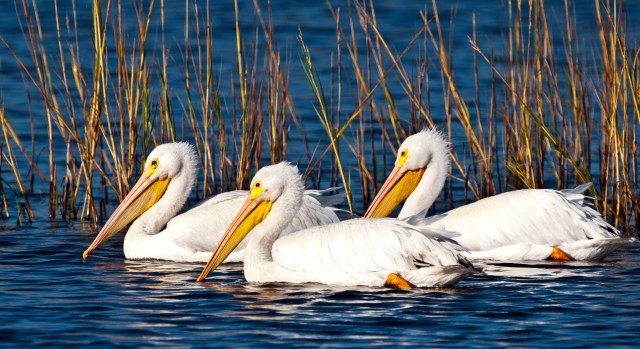 Unlike the Brown Pelican, the American White Pelican does not dive for its food. Instead, it catches its prey while swimming. Several pelicans may fish cooperatively, moving into a circle to concentrate fish, and then dipping their heads under simultaneously to catch fish. Adult male pelicans can weigh as much as 30 pounds; however, they average 20 pounds. Apart from the difference in size, males and females look exactly alike. Their wingspan is between 95-120 inches.