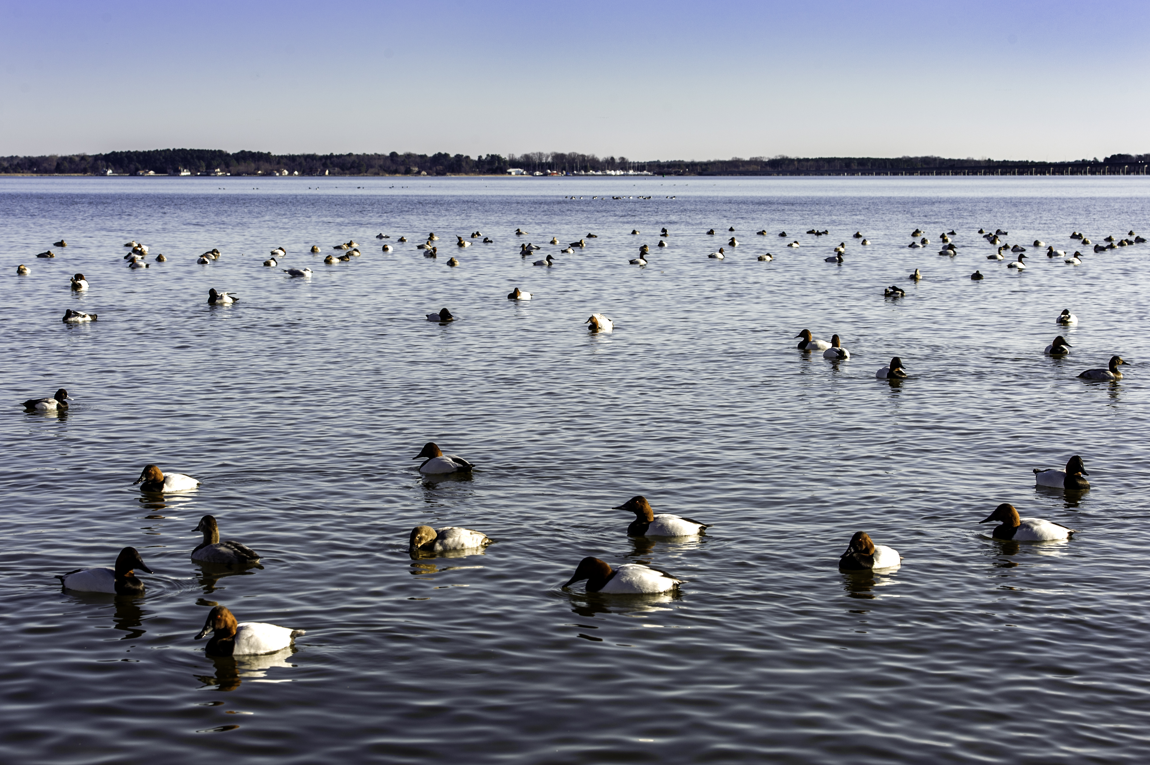 We arrived in Cambridge shortly after sunrise, and at the first place we stopped along the Choptank River, all we found were Canada Geese. However, we also found a group of serious birders, who told us about a nearby location that typically has wintering, migratory ducks. When we arrived at that location, there were two other photographers and a couple of hundred ducks. We got EXCITED! This was going to be better than we had imagined.