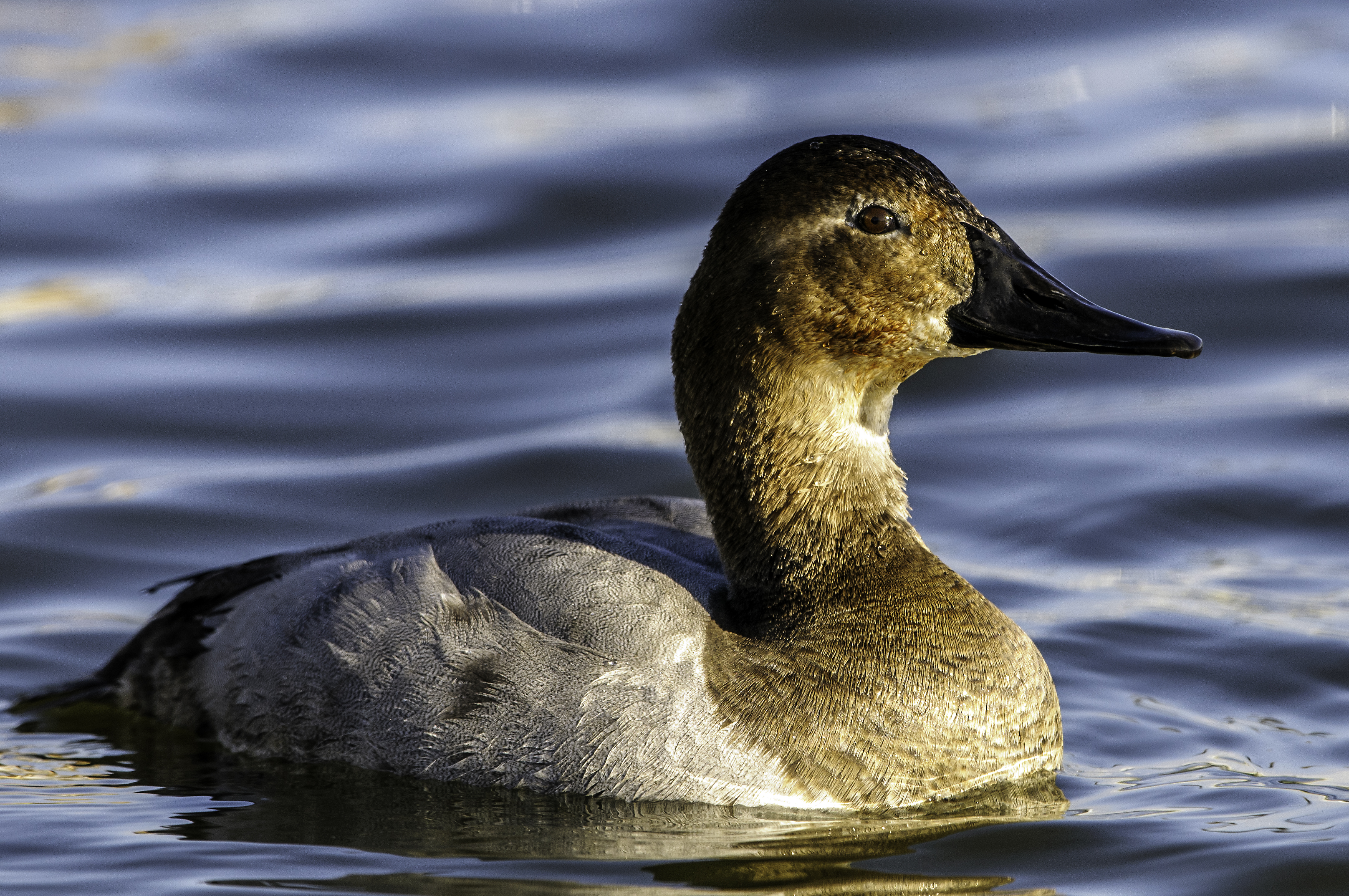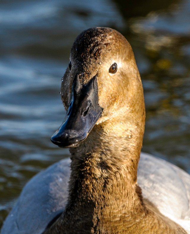 Canvasbacks are large diving ducks that got their name from early European settlers that thought their backs were canvas-like in color. In the early 1950s, it was estimated that there were 225,000 Canvasbacks wintering on the Chesapeake Bay; this represented one-half of the entire North American population. By 1985, there were only 50,000 Canvasbacks wintering there. Canvasbacks were extensively hunted around the turn of the century, but federal hunting regulations now restrict their harvest. Today, the population has stabilized and is increasing slightly, although it is nowhere near previous levels. Below are 4 photos of the male and 2 of the female Canvasbacks. There were many more males than females.