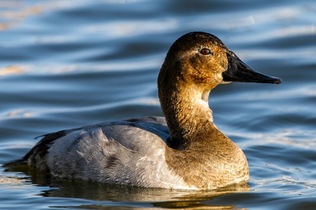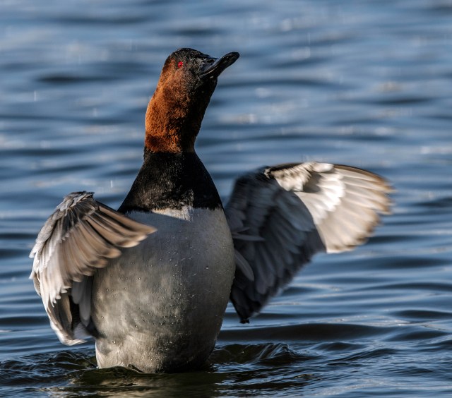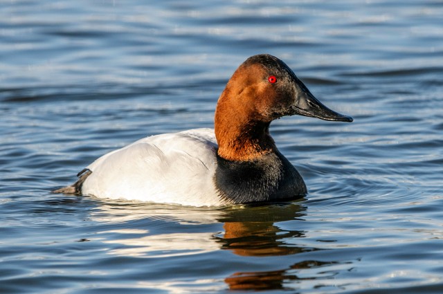 Finally, below is a photo of the single Redhead Duck that I saw among the hundreds of other ducks. It seemed to be the most wary and stayed further out than the other ducks. Although smaller, it was somewhat difficult to distinguish from the Canvasbacks, because its head was similarly colored, but it had yellow eyes, instead of red, and its back was grey, instead of white.
