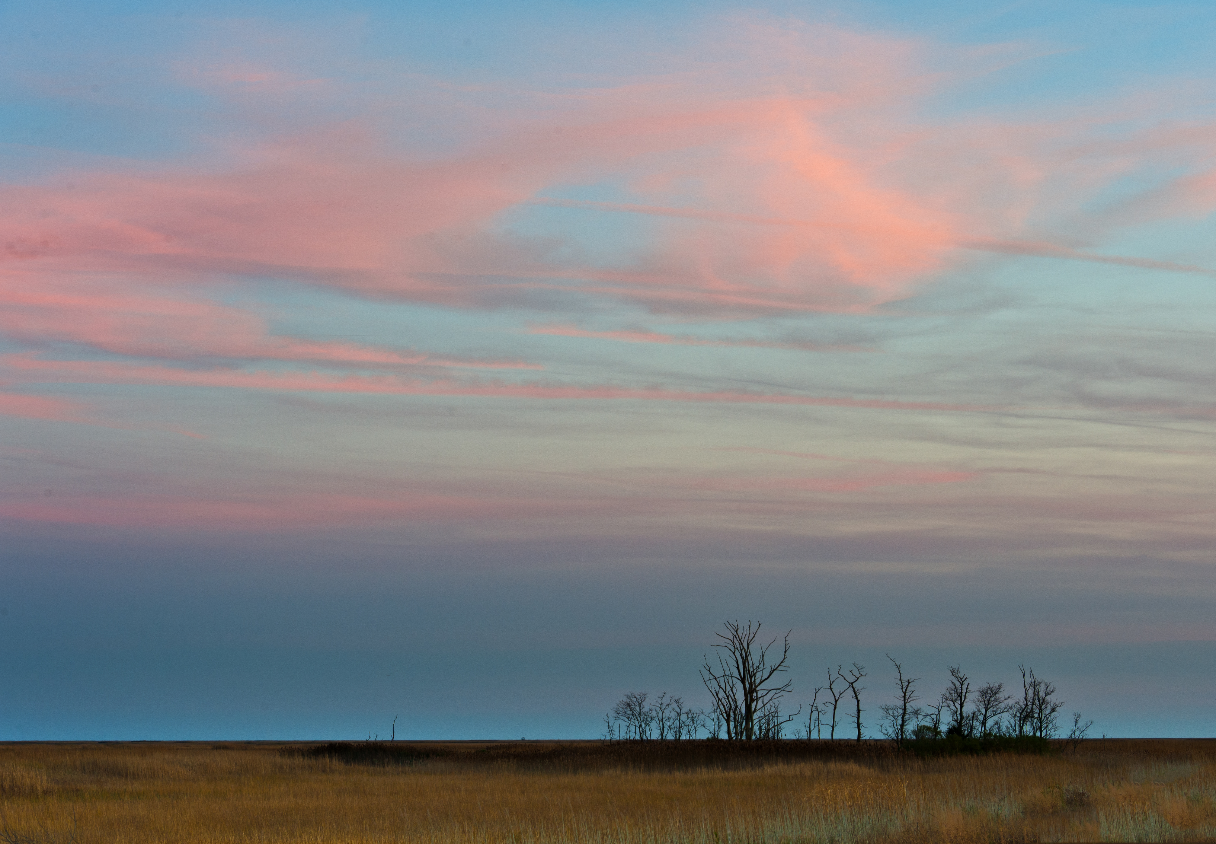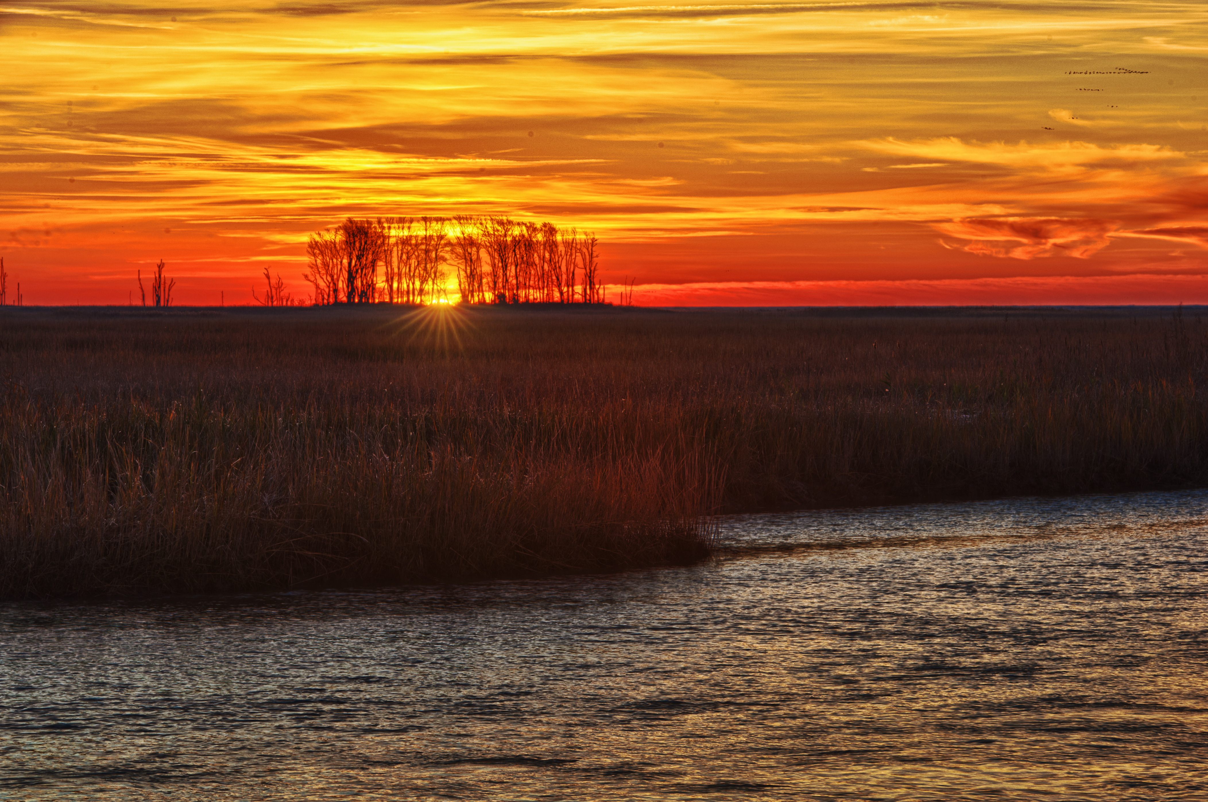 Based on my recent blog posts, some of you who follow my blog may think that I am predominantly interested in birds, but that is not true. I love being outdoors in the peaceful serenity of a natural, unspoiled setting, like a refuge or preserve, and if I am fortunate enough to also see some wildlife, it just makes the experience even better. I greatly enjoy sunrises and sunsets–they are all beautiful, but some are incredibly spectacular. The nice thing about sunsets is that I do not have to get up before the crack of dawn to see and photograph them. However, when I see a gorgeous, memorable and photographic sunrise, it makes getting up very early worthwhile, like the two sunrises below. (First image: Bombay Hook, and second image: Blackwater).