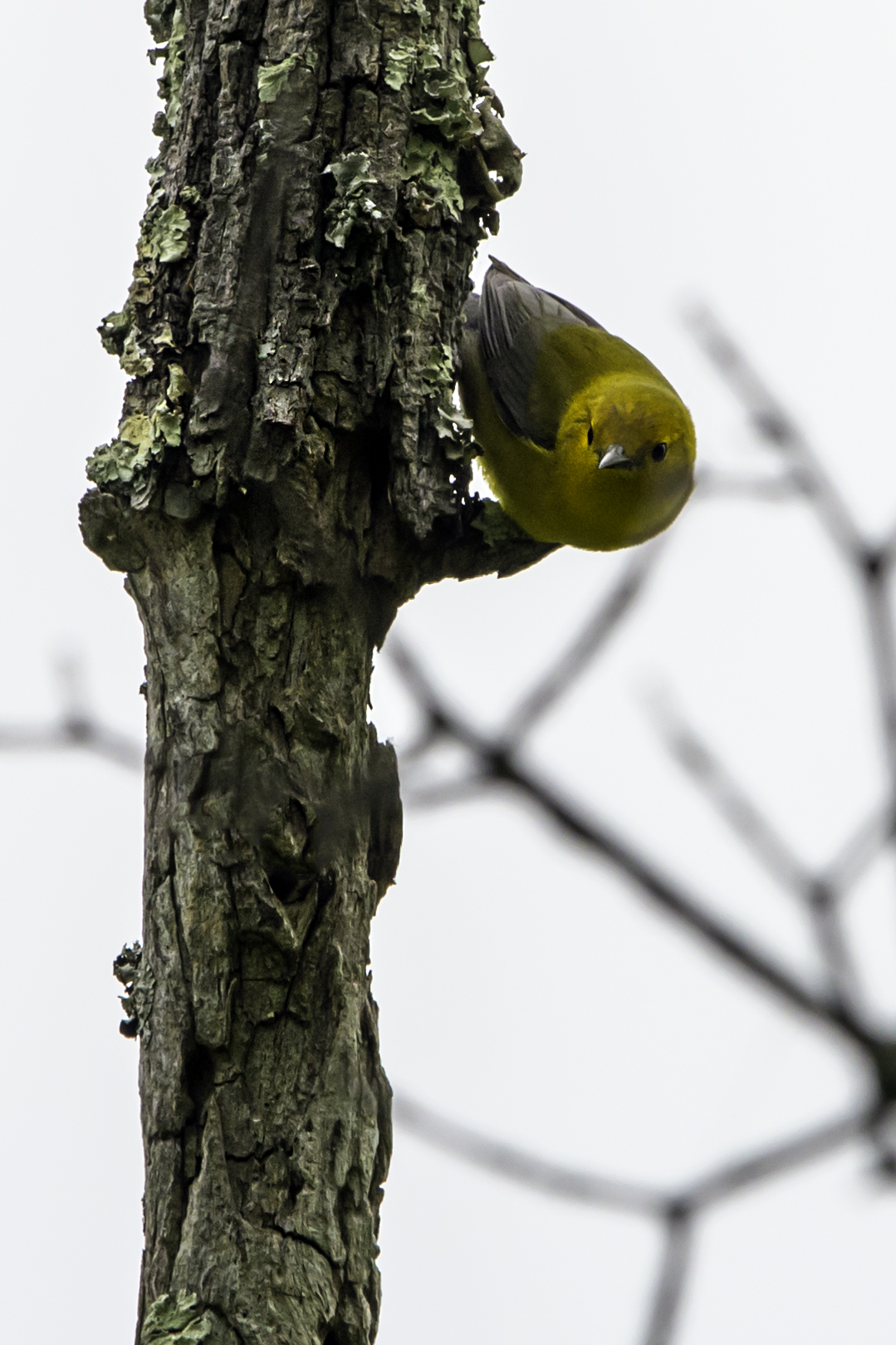 Below is an adult male Blue-winged Warbler. They winter in Central America, and I suspect it, as well as the Rose-breasted Grosbeak, were migrating north through Virginia. The breeding male Blue-winged Warbler is unmistakable. It is yellow above and below. Its wings are gray with two white bars, and there is a black eye stripe. Females are duller, but otherwise similar. They feed on insects and spiders.