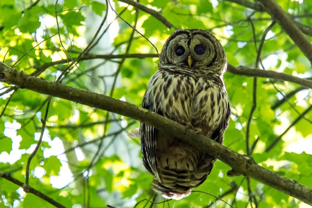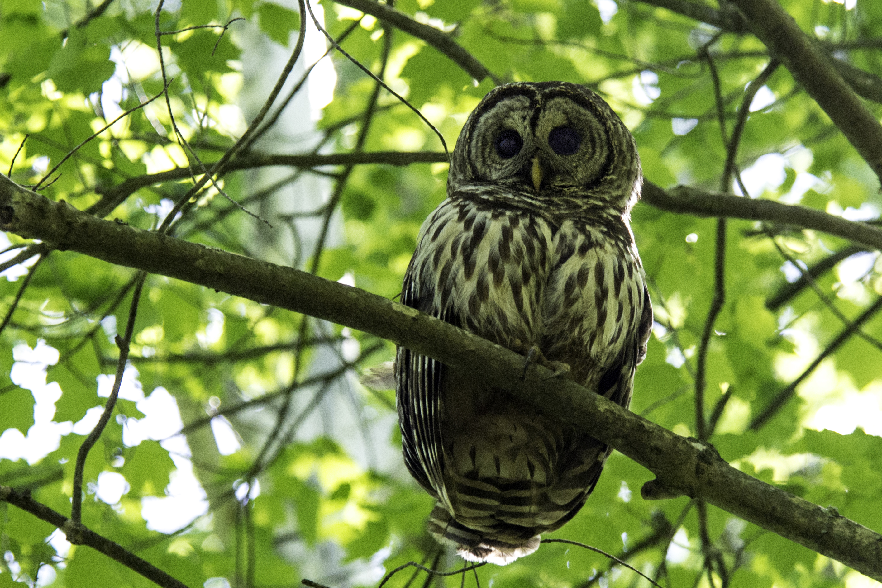 As mentioned above, I have many more images to review and process from last weekend, and will eventually upload them here or to my website. I am also behind in posting other images due to conflicting commitments and spending more time shooting photos than processing them. In an attempt to get partially caught up, below are two images of the Barred Owls that I discovered in late March and that I photographed about two weeks ago. The trees are fully leafed out now, which makes getting a clear shot of them very difficult.