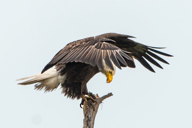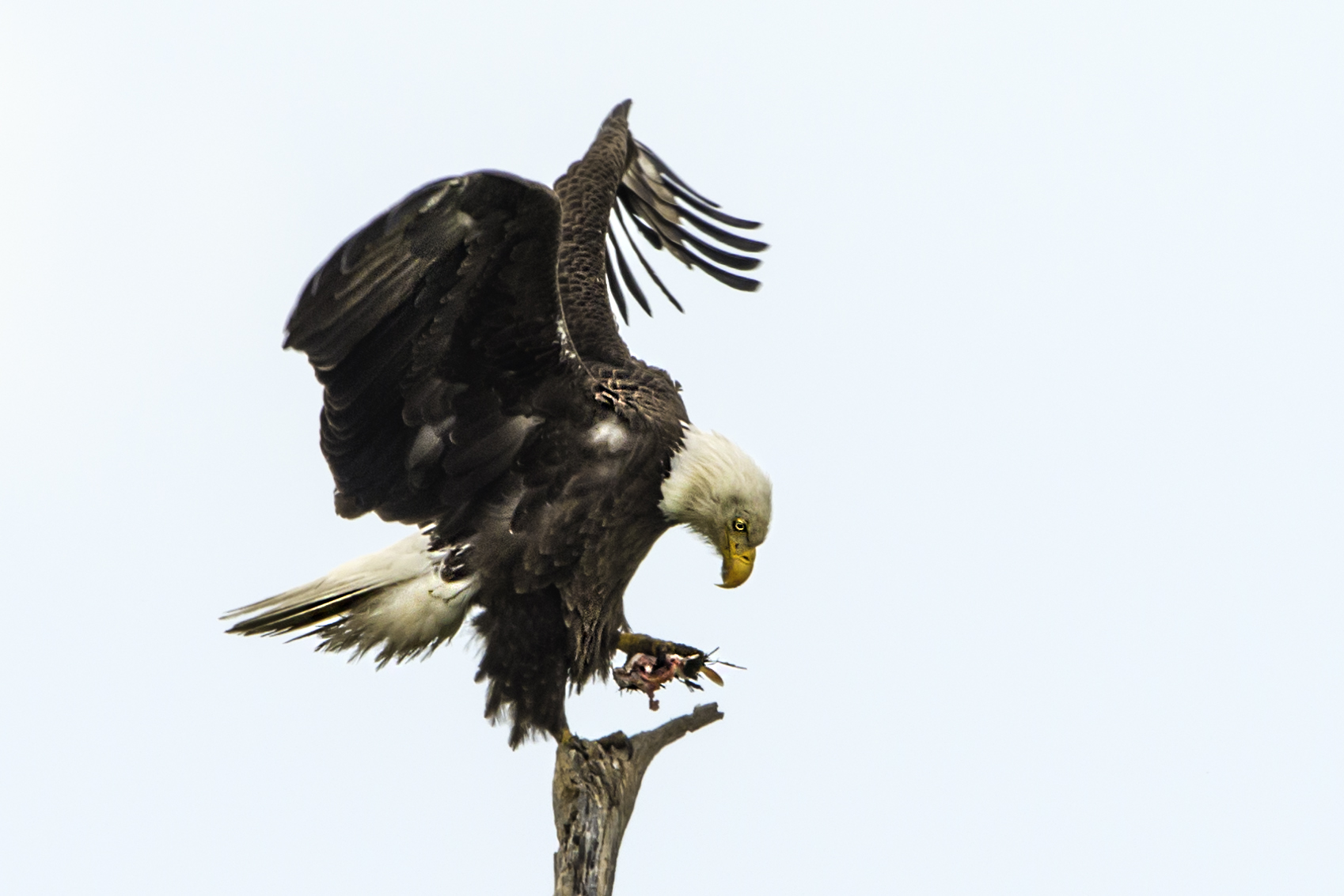 Since nothing was happening at Slaughter Beach, I went to Blackwater National Wildlife Refuge in Maryland. Blackwater was not disappointing, because it was very active with adult and juvenile eagles, as well as an active eagle’s nest with two eaglets in it. I have only started to process my images from last weekend, but below are two of the eagle images. In the below images, an eagle had just returned to a favorite perch in a tall, old dead tree with a piece of its prey.
