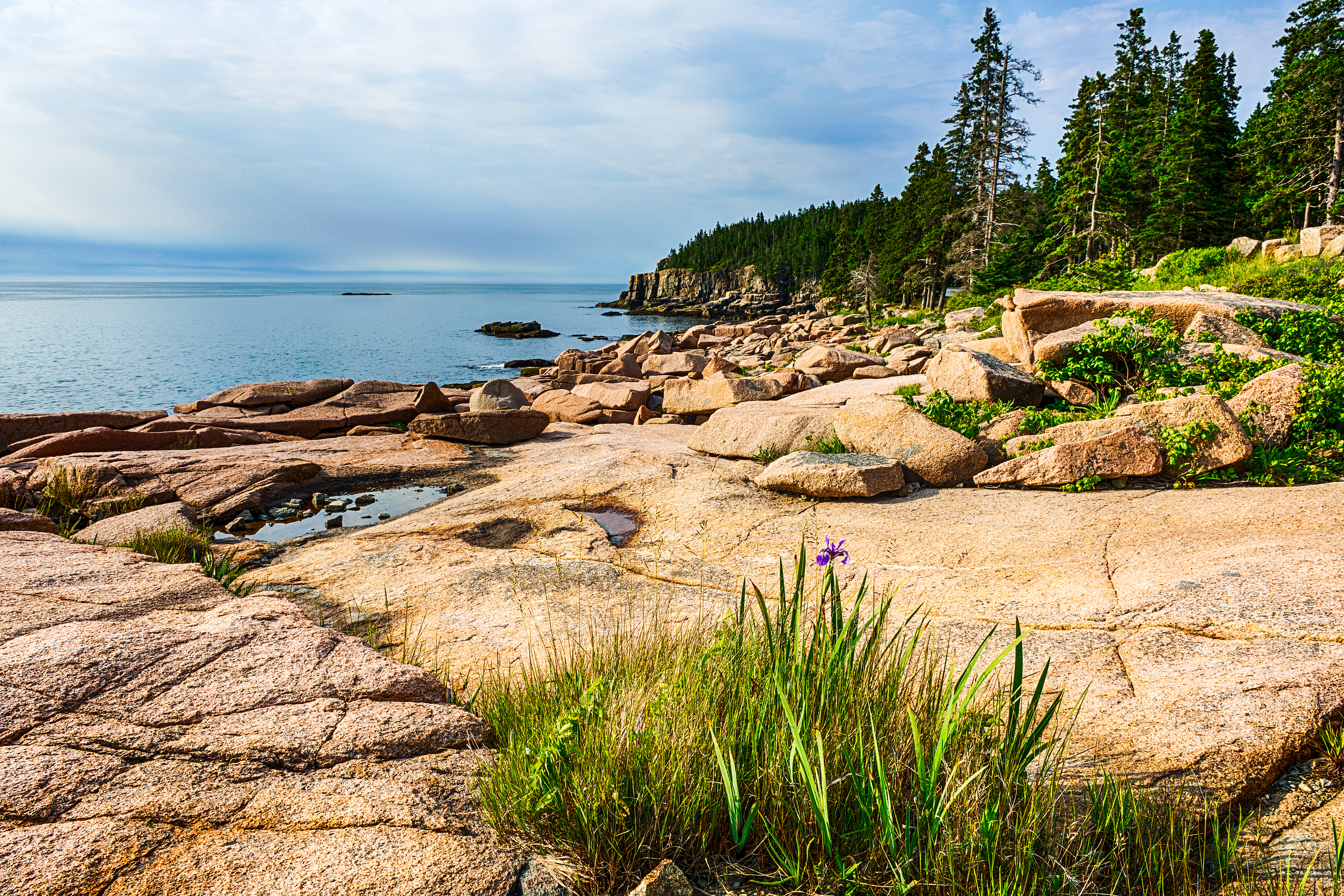 In the opening image above, there is a lone Iris flower growing between the huge rocks along the coast on Mount Desert Island. This image was taken shortly after shooting the sunrise from Cadillac Mountain, and the early morning sun was lighting the island’s eastern shoreline.