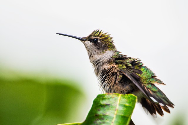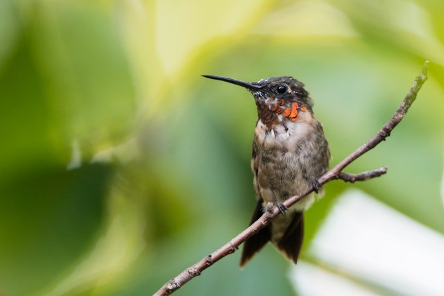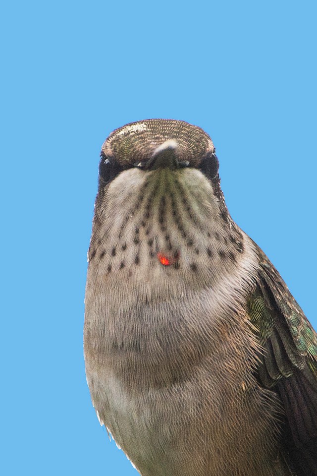 In this last image (below), a closeup of the female Ruby-throated Hummingbird, her one and only bright red feather on her throat can be seen. Although the male Ruby-throated Hummingbirds have a large band of bright red feathers on their necks, the females have only one that is rarely seen and only when the light strikes it just right, making it glow brightly.
