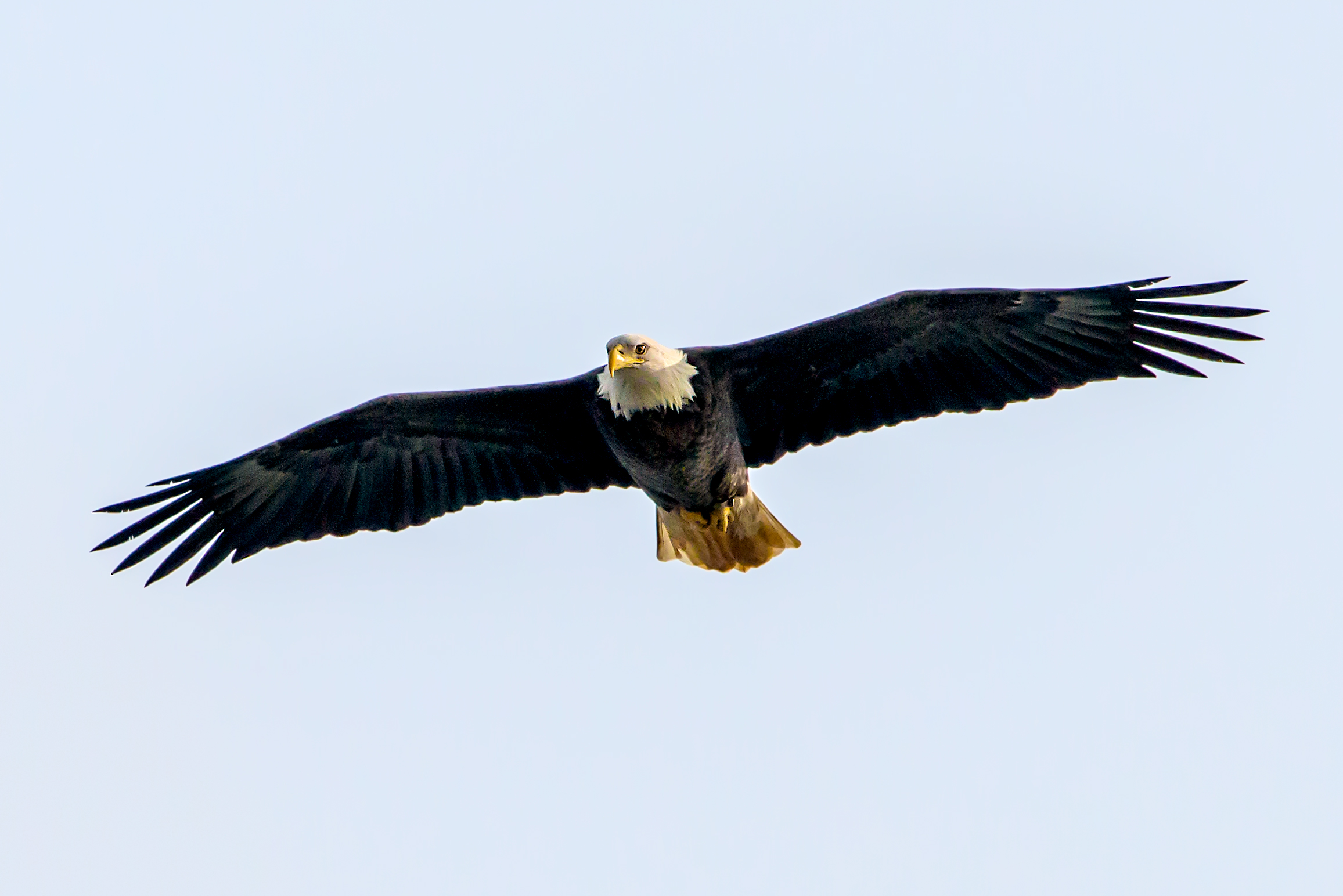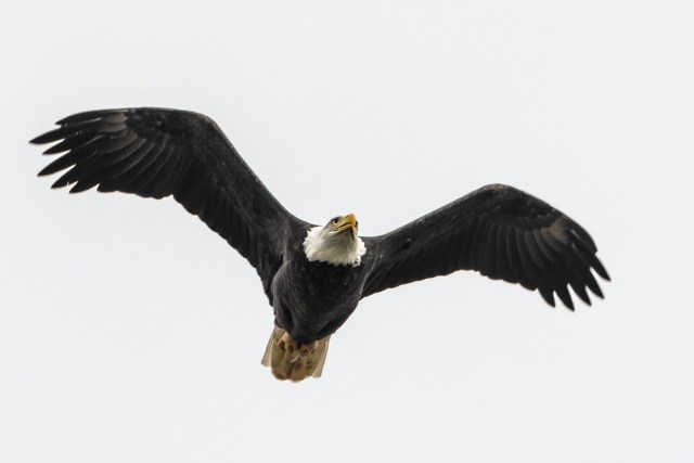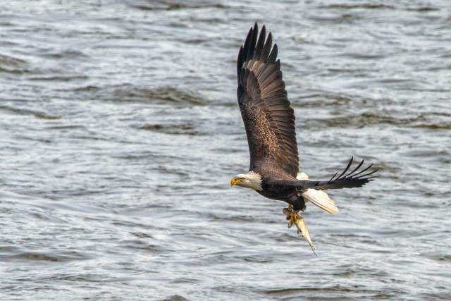 The above image is my favorite of the day. Unfortunately, it was the only opportunity to photograph one of the eagles capturing a fish, and it happened soon after arriving at the dam. Click on the image to see it in detail and notice how it appears to be watching me as I photographed it. The following are some other images of adult eagles as they flew around the dam and river.