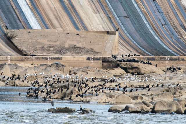In the fall, and in particular in November, the dam is well known as a location to see American Bald Eagles, and it is not uncommon to see as many as 100 eagles feeding on fish in the Susquehanna River. The eagles and other birds congregate around the dam, because when the dam is opened to power the generators, the water flowing through the dam churns up fish for the waiting birds. Below you can see the hundreds of well-fed Cormorants, Blue Herons, and gulls at the base of the dam. If you click on the image and look closely, there is also a juvenile eagle sitting on the end of a concrete embankment.
