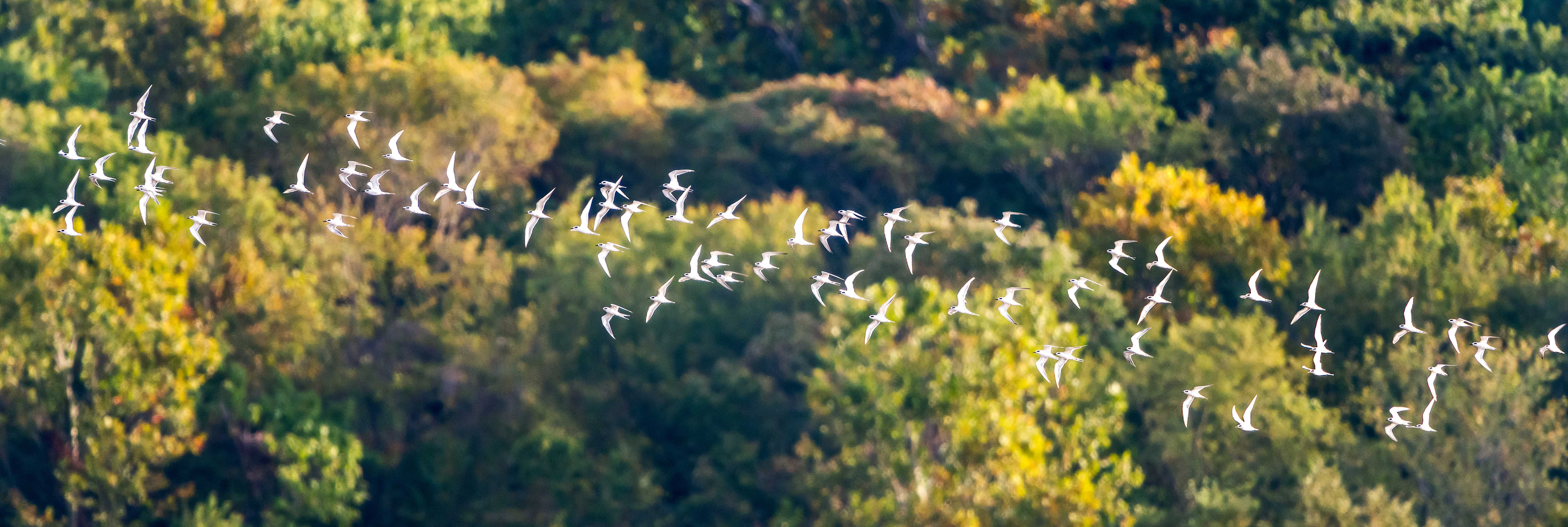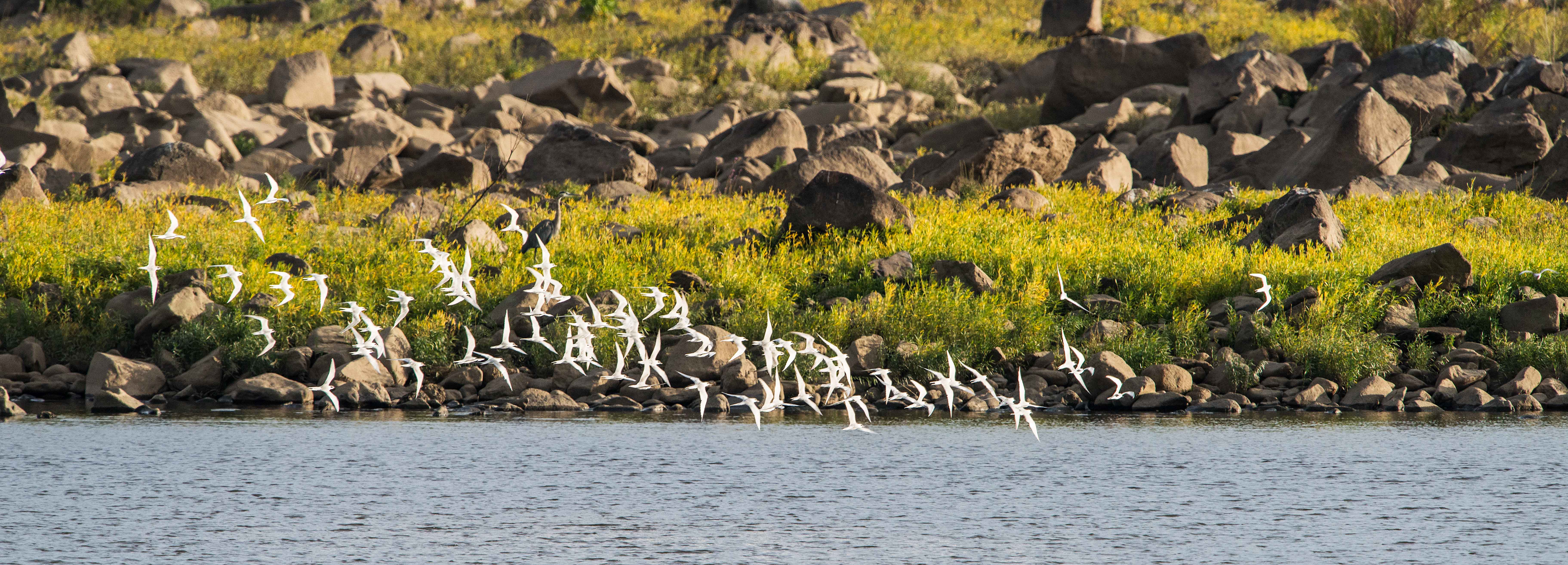 Besides enjoying the sight of these majestic birds, across the river a group of terns occasionally took flight, when an eagle got too close. When the terns nervously flew about, their white bodies were brightly lit by the early morning sun.