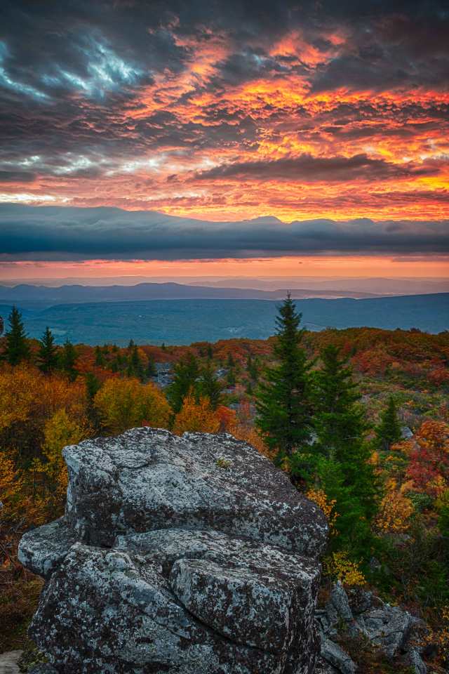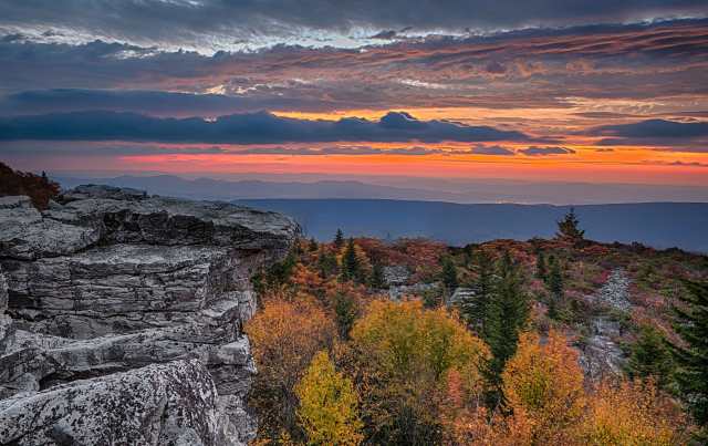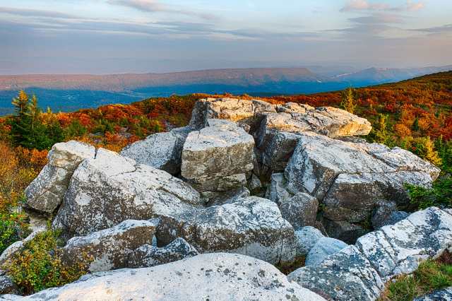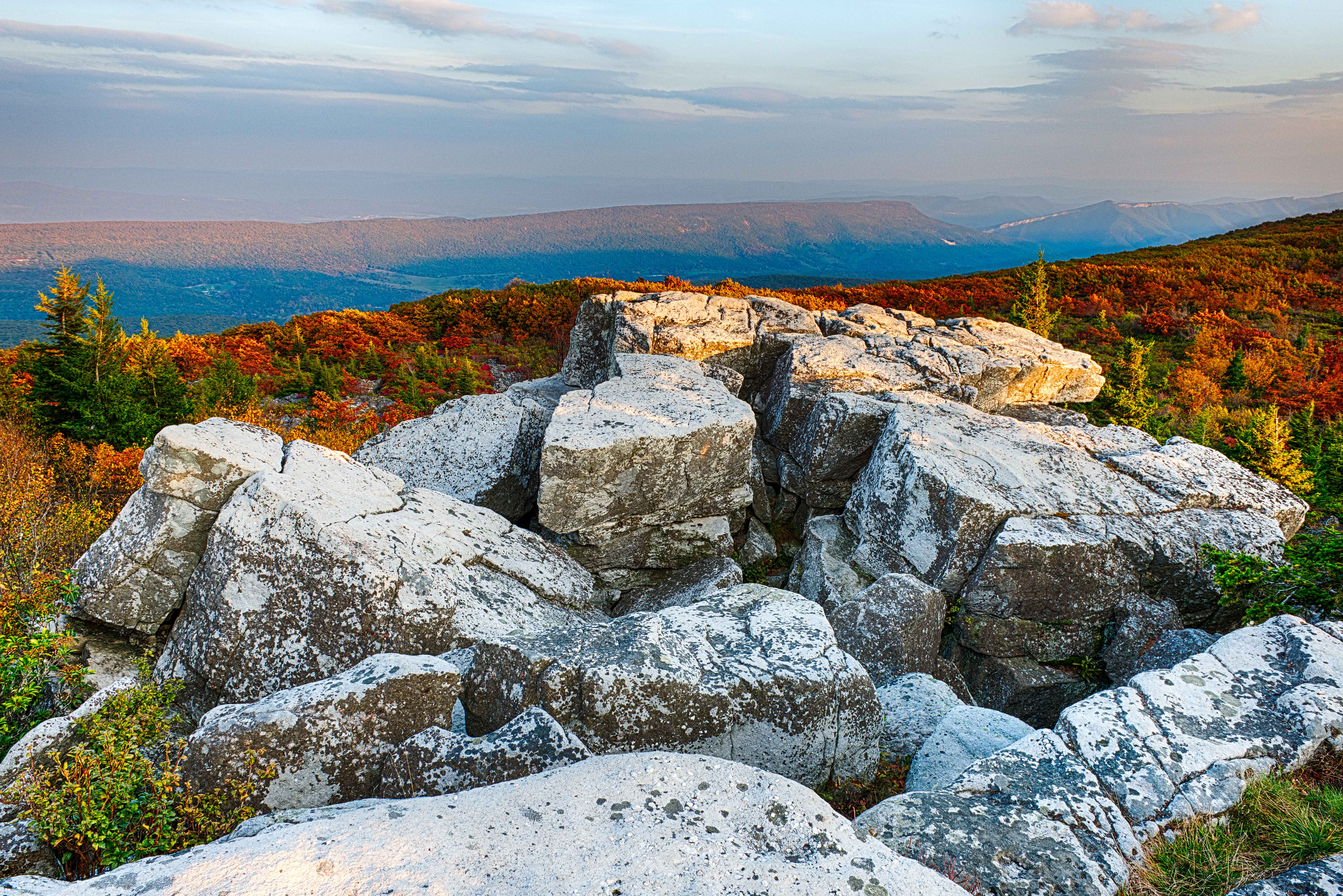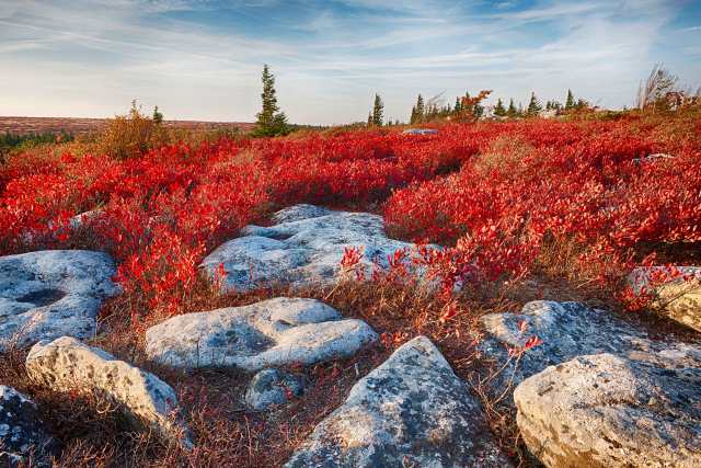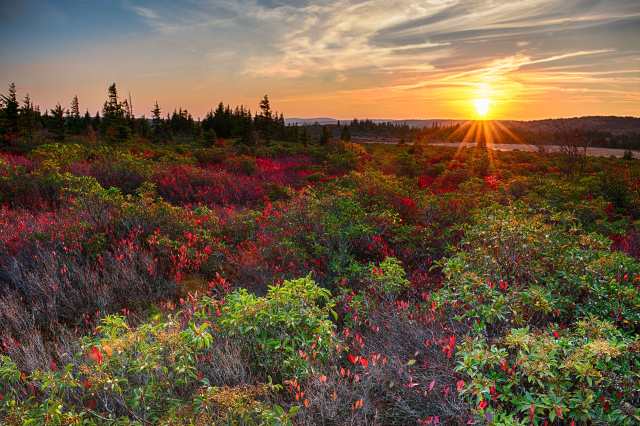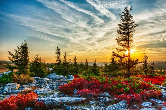 Dolly Sods is a rocky, high-altitude plateau, ranging from 2,700 to over 4,00o feet. It is located in in the Allegheny Mountains of eastern West Virginia in the Monongahela National Forest. Dolly Sods Wilderness encompasses 17,371 acres within over 32,000 acres of forest. When on the highest elevations of the plateau, there are wide sweeping views of the mountains to the east. The views are breathtaking and sunrises can be spectacular, depending on the weather and cloud cover.
