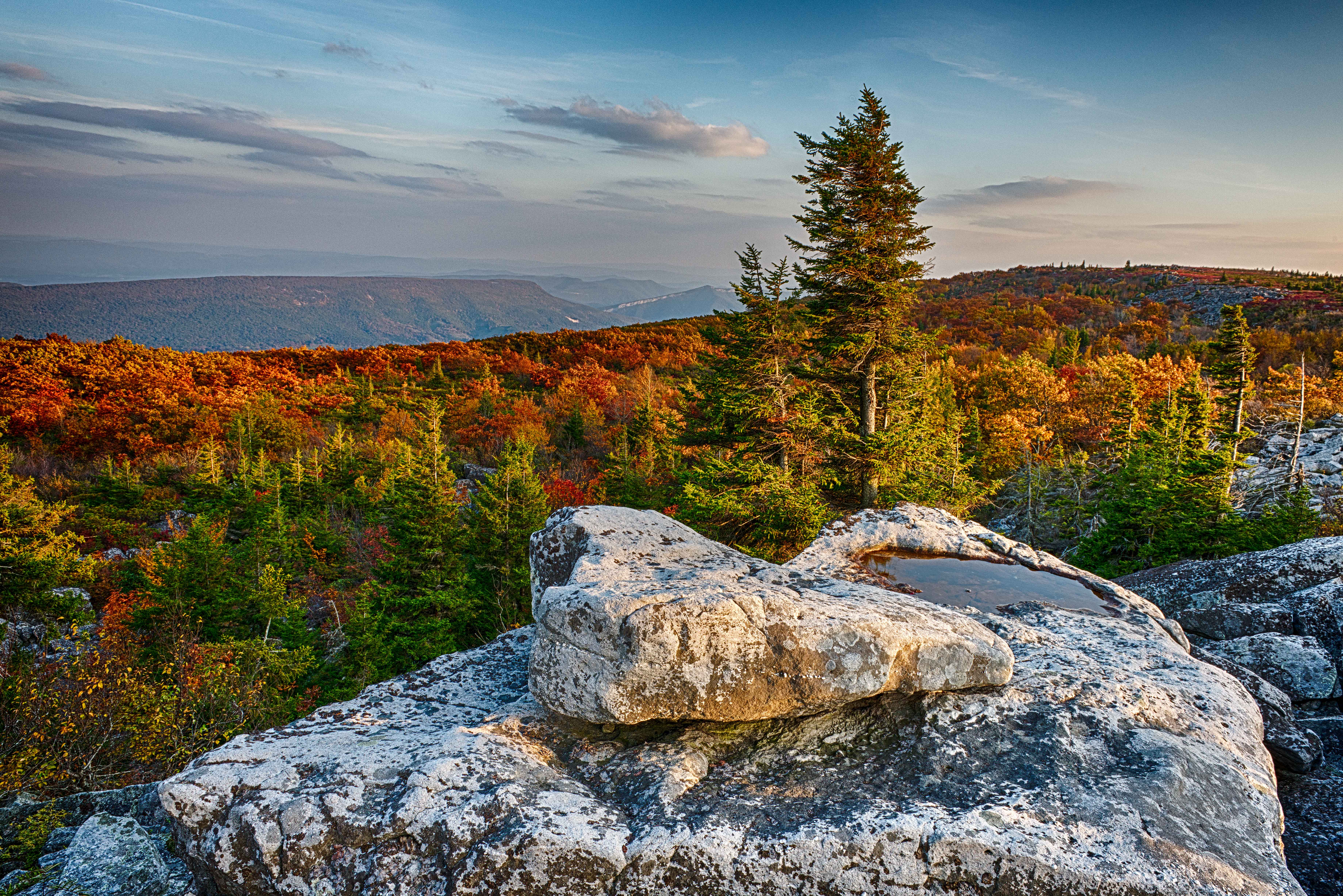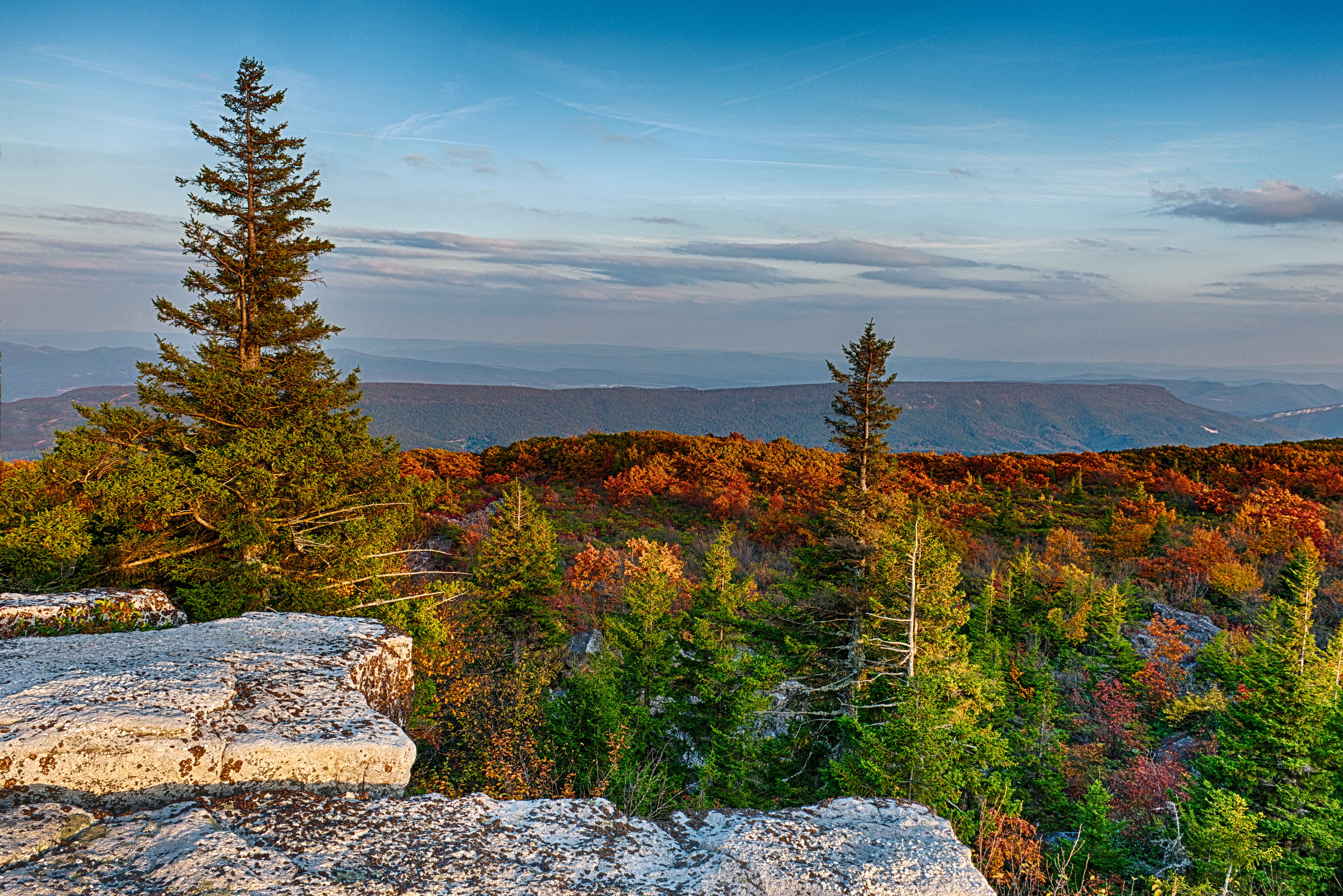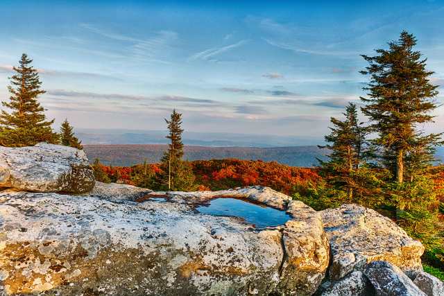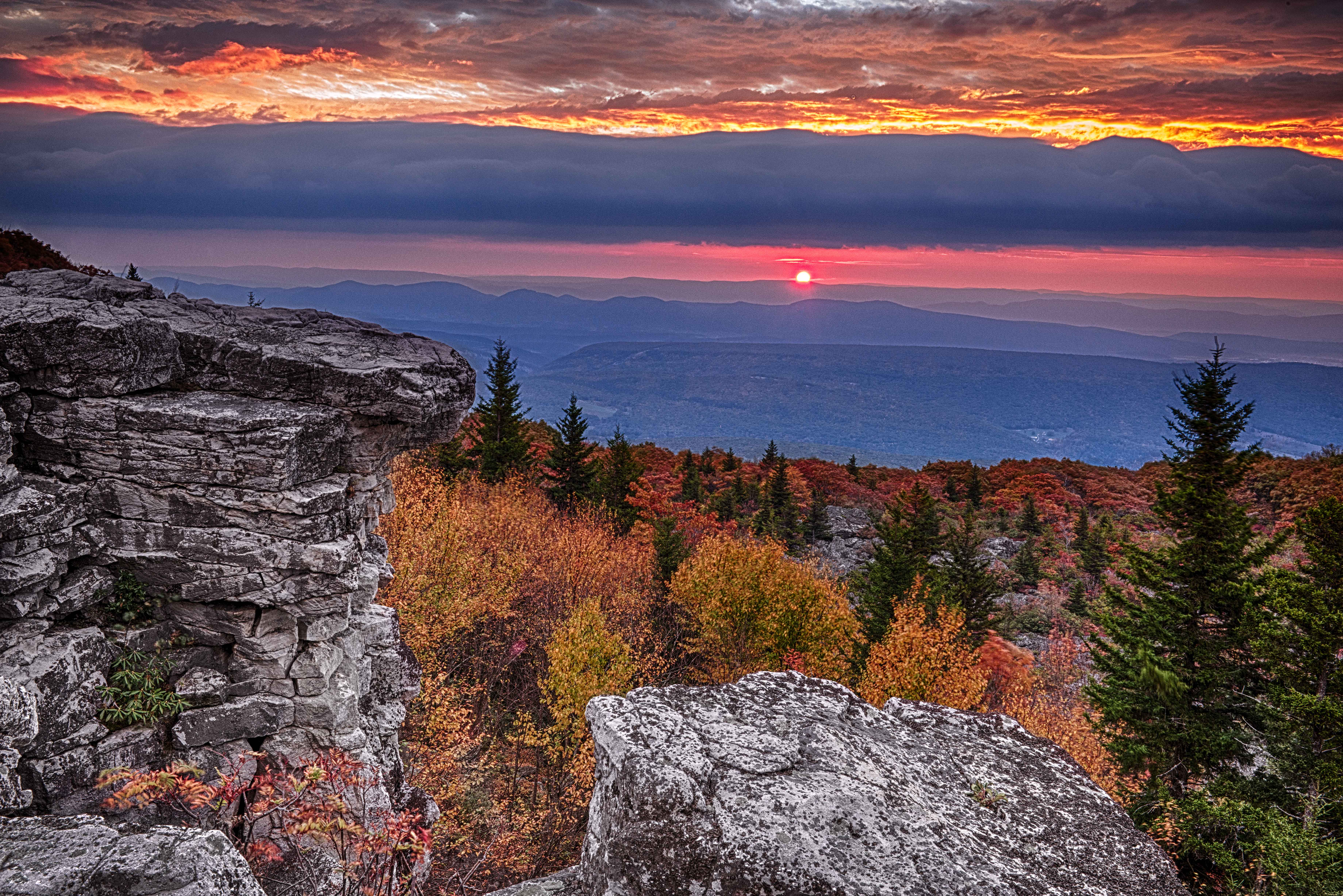 Dolly Sods is a rocky, high-altitude plateau, ranging from 2,700 to over 4,00o feet. It is located in in the Allegheny Mountains of eastern West Virginia in the Monongahela National Forest. Dolly Sods Wilderness encompasses 17,371 acres within over 32,000 acres of forest. When on the highest elevations of the plateau, there are wide sweeping views of the mountains to the east. The views are breathtaking and sunrises can be spectacular, depending on the weather and cloud cover.