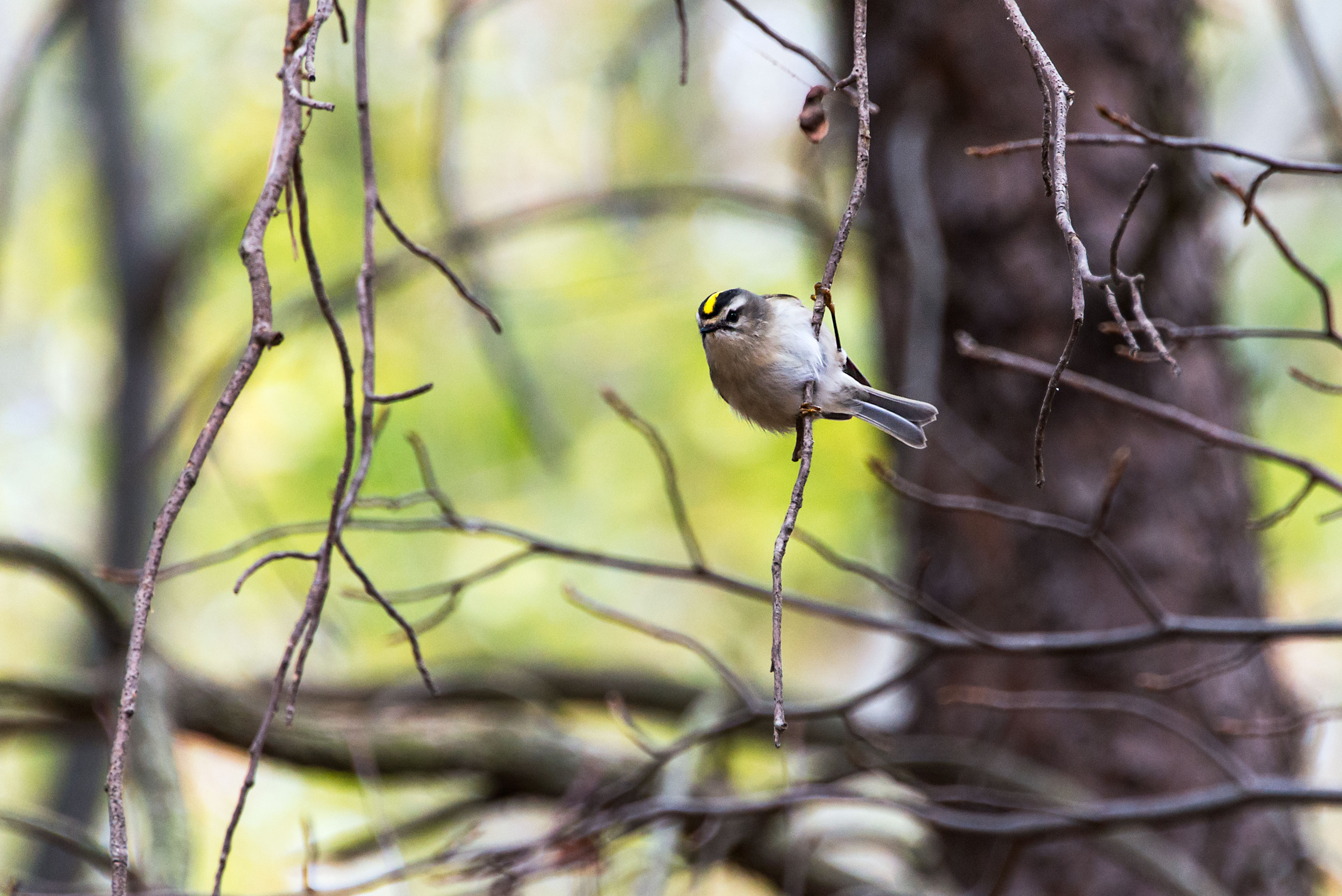 When the small bird came down from the tree tops and perched on a nearby branch, I was able to see it more clearly in my camera’s view finder, and it was a Golden-crowned Kinglet! And, it was checking me out. The kinglet was fast and kept flitting from branch to branch. Below is a shot of the kinglet just about to land on a branch.