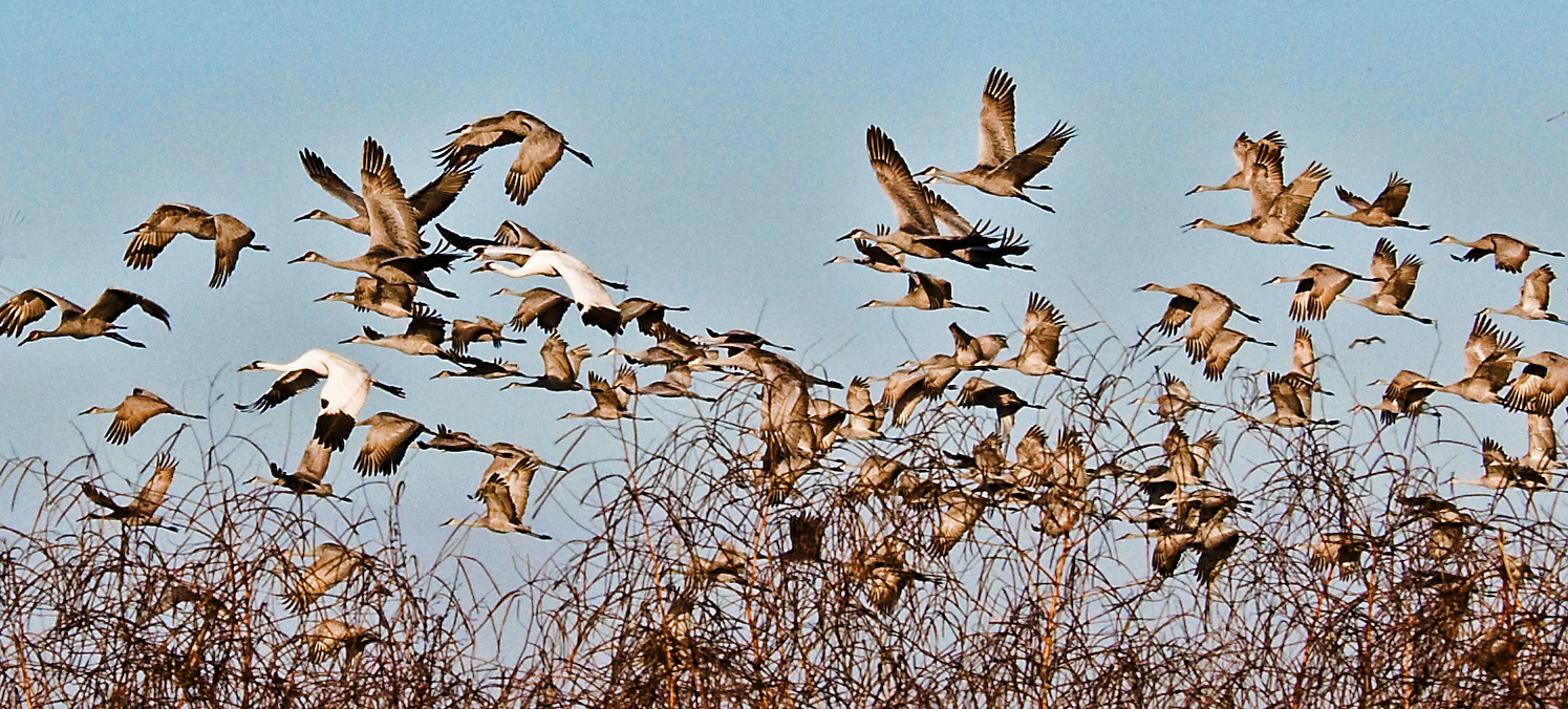 I took the below image in 2008, when a large group of cranes was taking off early in the morning. Among the Sandhills were two Whooping Cranes.