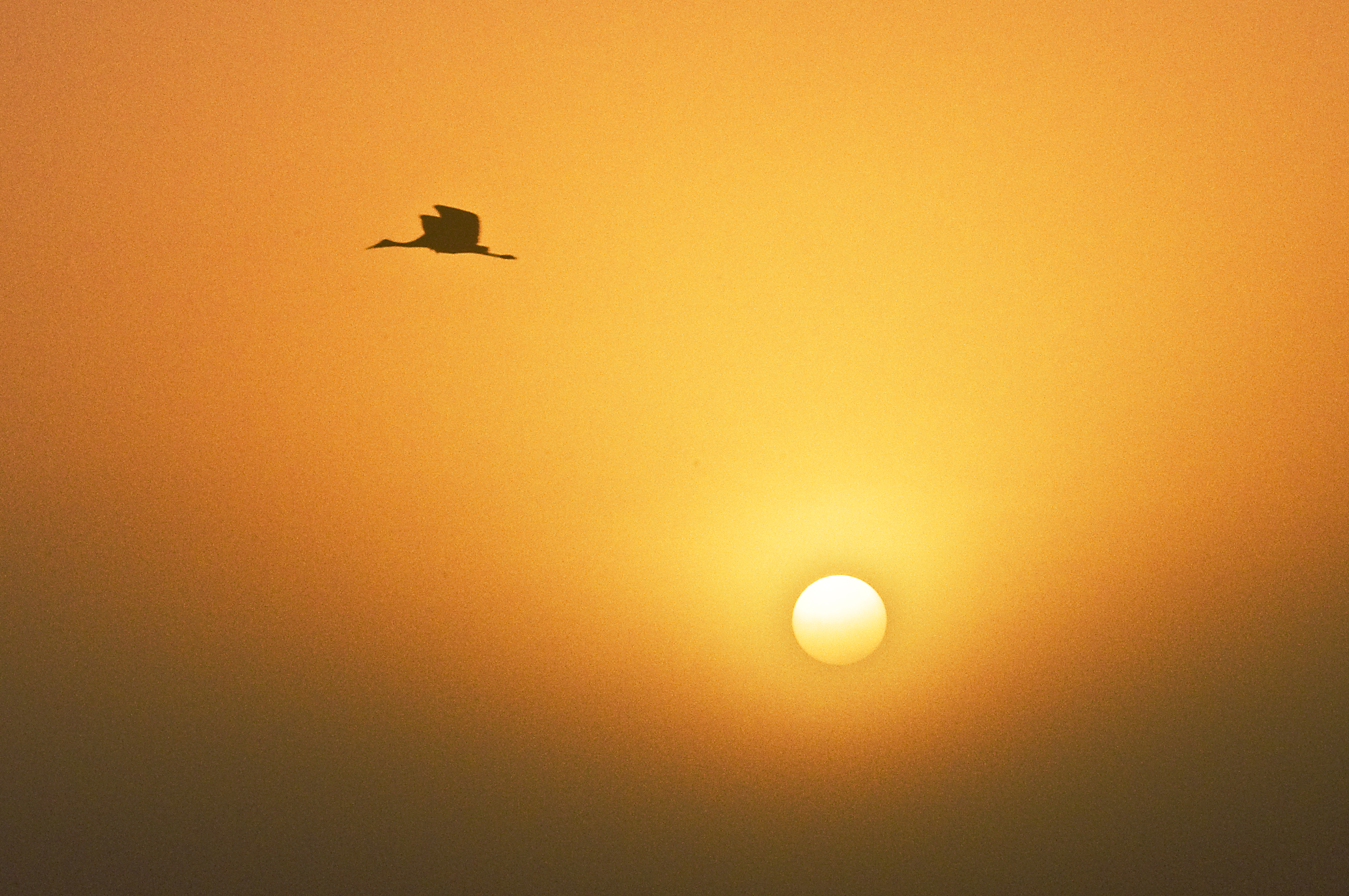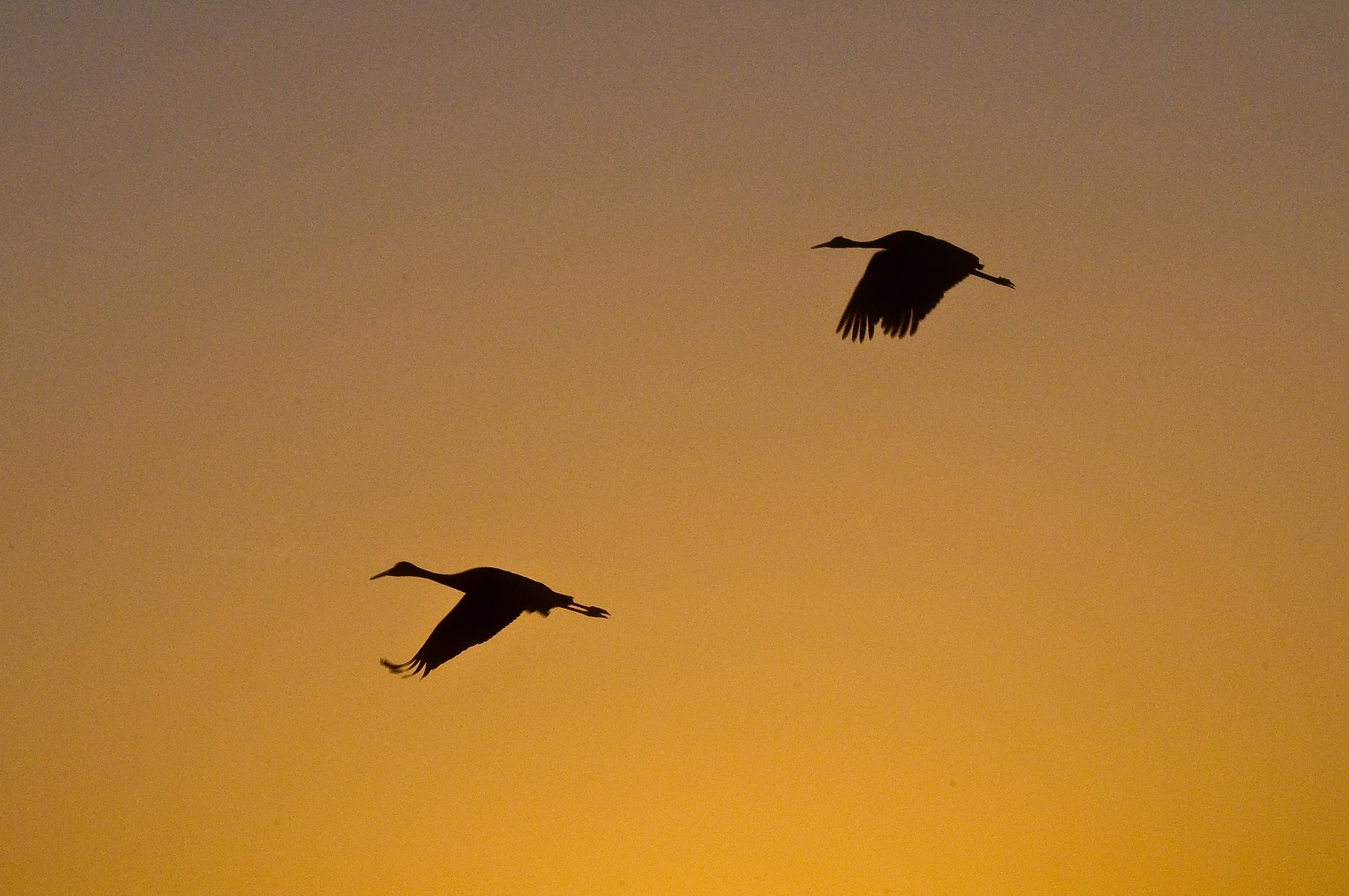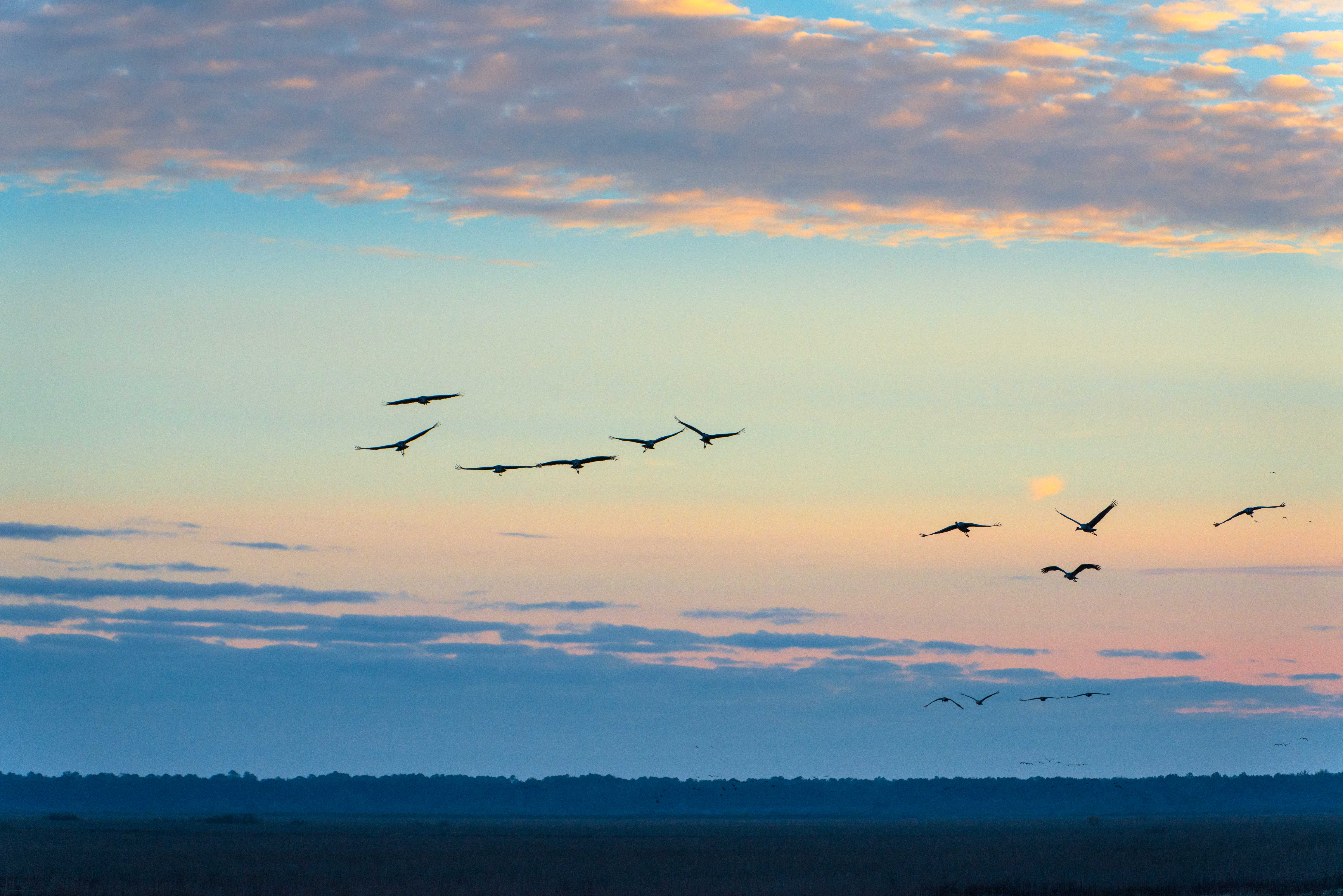 Below are several images of the Sandhill Cranes flying back to the Prairie after feeding at local fields, farms and ranches, and other wetlands. Flying Sandhill Crane silhouettes are striking against a sunrise or sunsetting sky. The first two are sunrise shots.