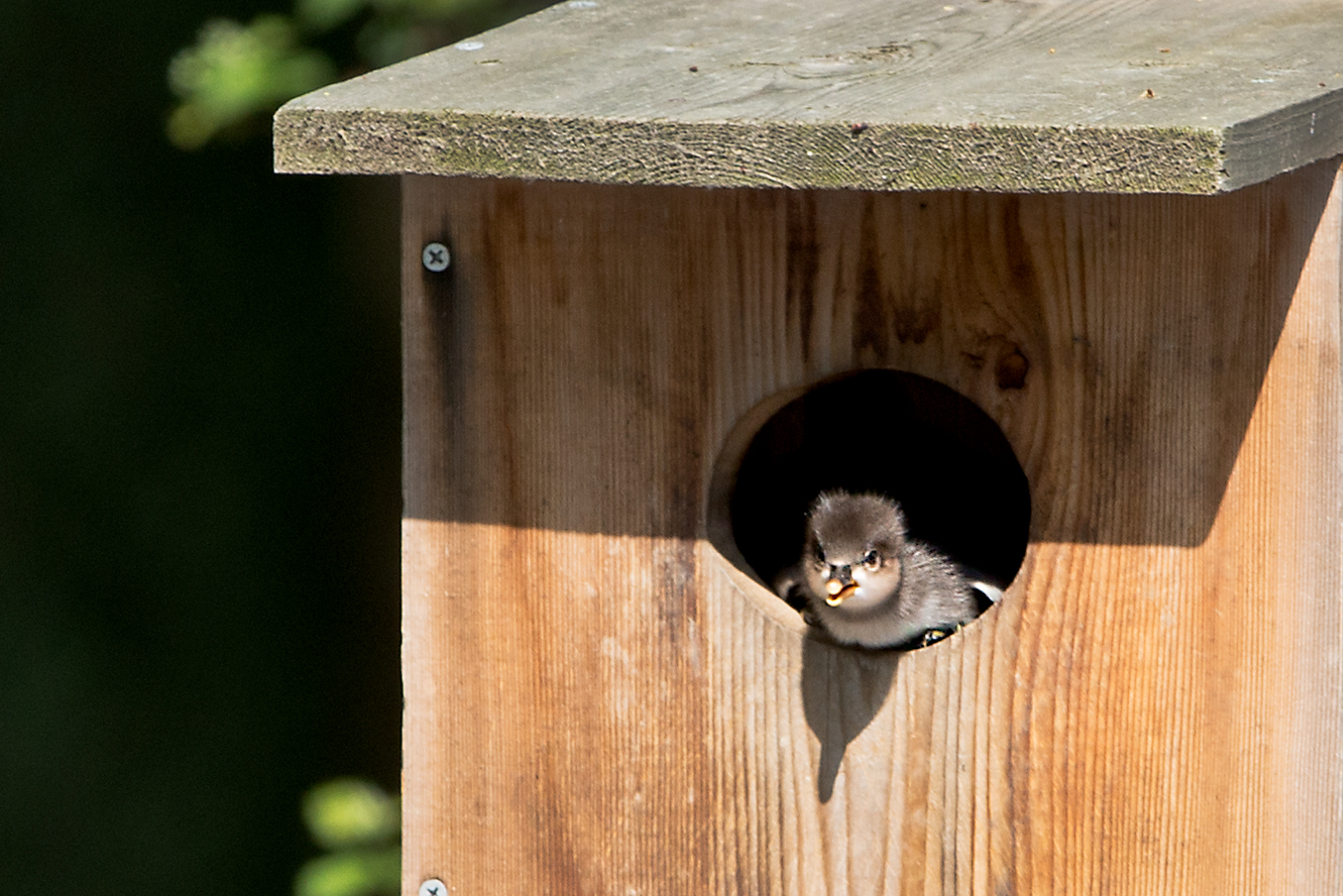 Shortly after my comment to Ernie, the hen Hooded Merganser flew down to the water, and then a duckling appeared at the nesting box opening (below image). I could not believe my eyes. Our timing was incredible!