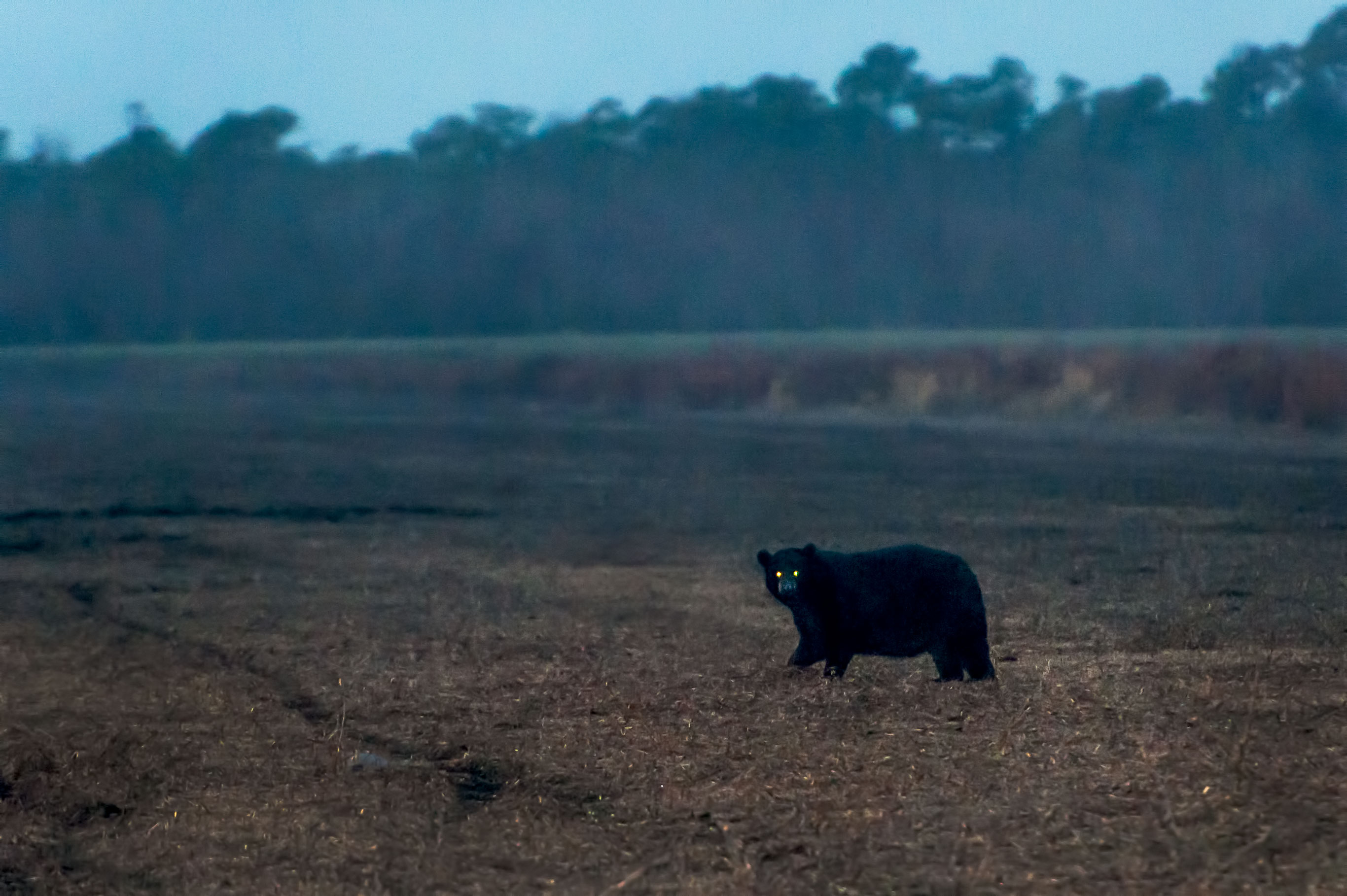 The first day at the OBX before sunrise, we drove to Alligator River NWR in search of Black Bears. Alligator River NWR contains over 154,000 acres and is one of the last significant habitats for Black Bear along the East Coast. Ernie had been there a few weeks earlier and had photographed several bears; therefore, our expectations were high. When we arrived at the refuge it was still dark, and we readied our cameras, lenses, and tripods, and then moved further up a dirt road separating open fields. As soon as we approached the first field, we spotted a large male bear. Since it was dark, I used a Nikon SB-900 Speedlight (flash) with a Better Beamer to extend and narrow the beam of light. The flash of light got the bear’s attention, turning directly toward us with its eyes glowing from the light (below). I also had to use a high ISO, and therefore, the image is grainy.