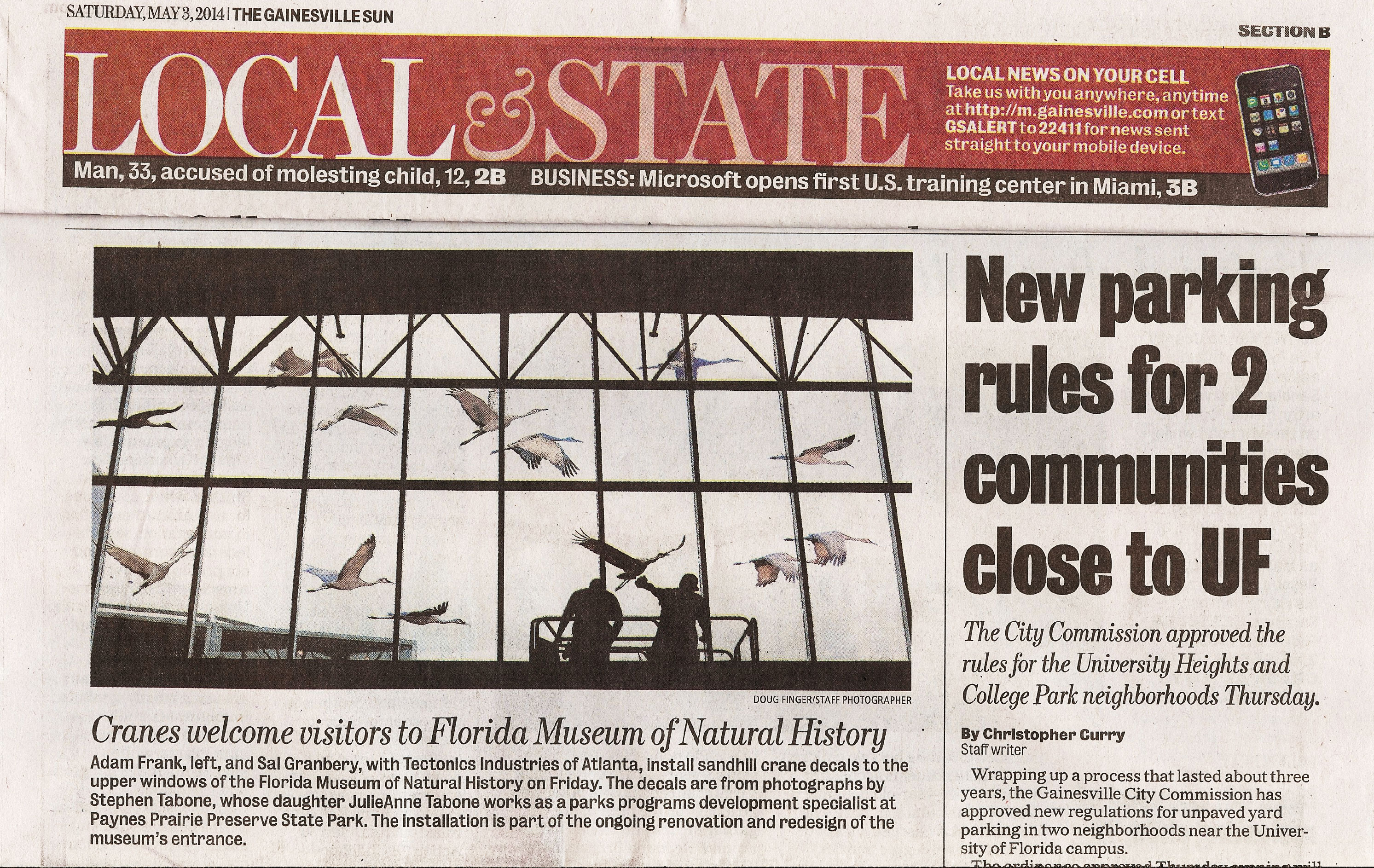 Above is the front page of the Local and State section of the Gainesville Sun (click on image to read caption), the local newspaper of Gainesville, Florida. As indicated in the May 3, 2014, article, the Florida Museum of Natural History is using my images of inflight Sandhill Cranes that I photographed at Paynes Prairie Preserve State Park. The Prairie is located just south of Gainesville. The museum is using the images as part of a permanent exhibit in its entrance, which is currently being renovated. There is another large set of similar windows in the atrium lobby adjacent to the one shown below that also contains the flying crane images.