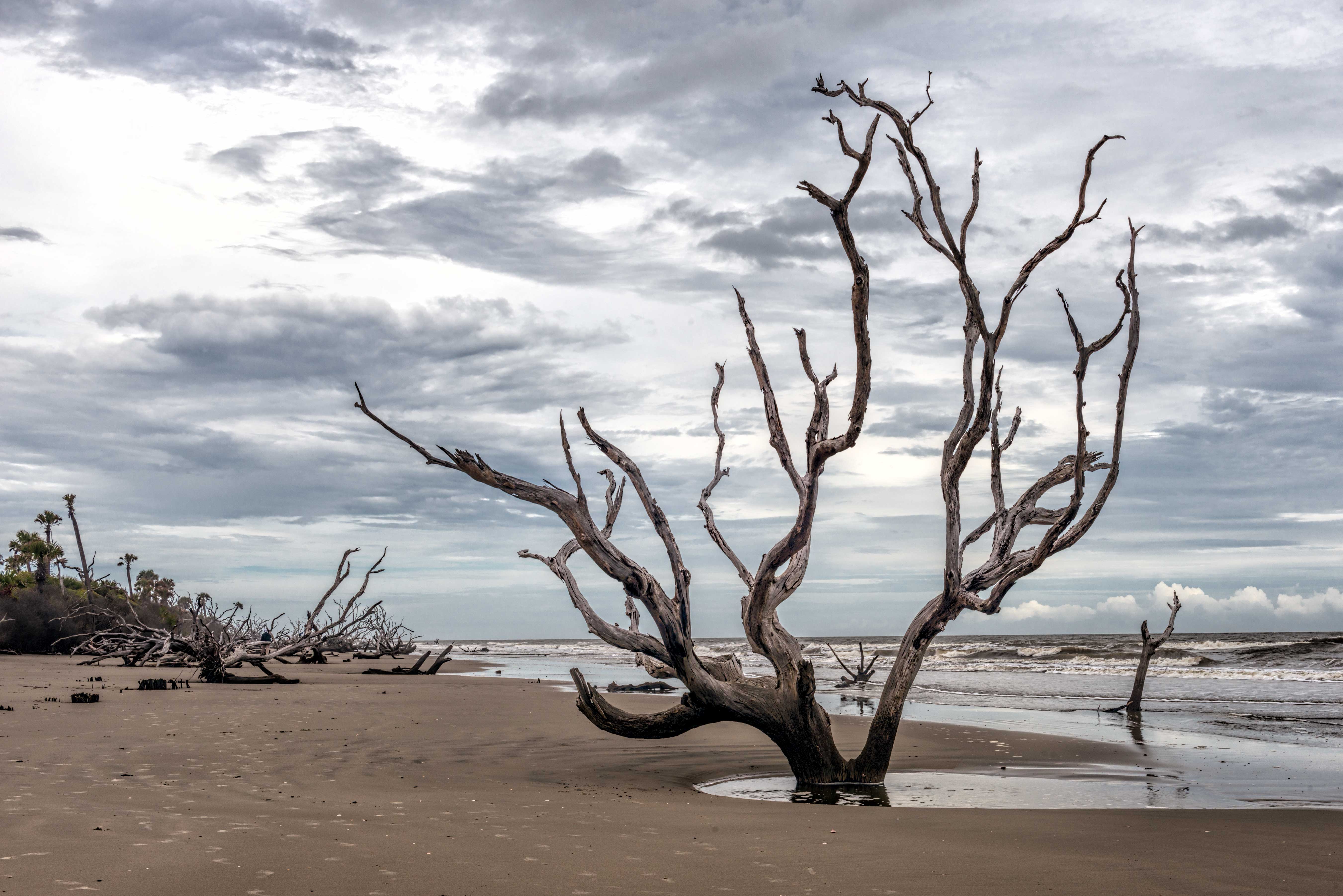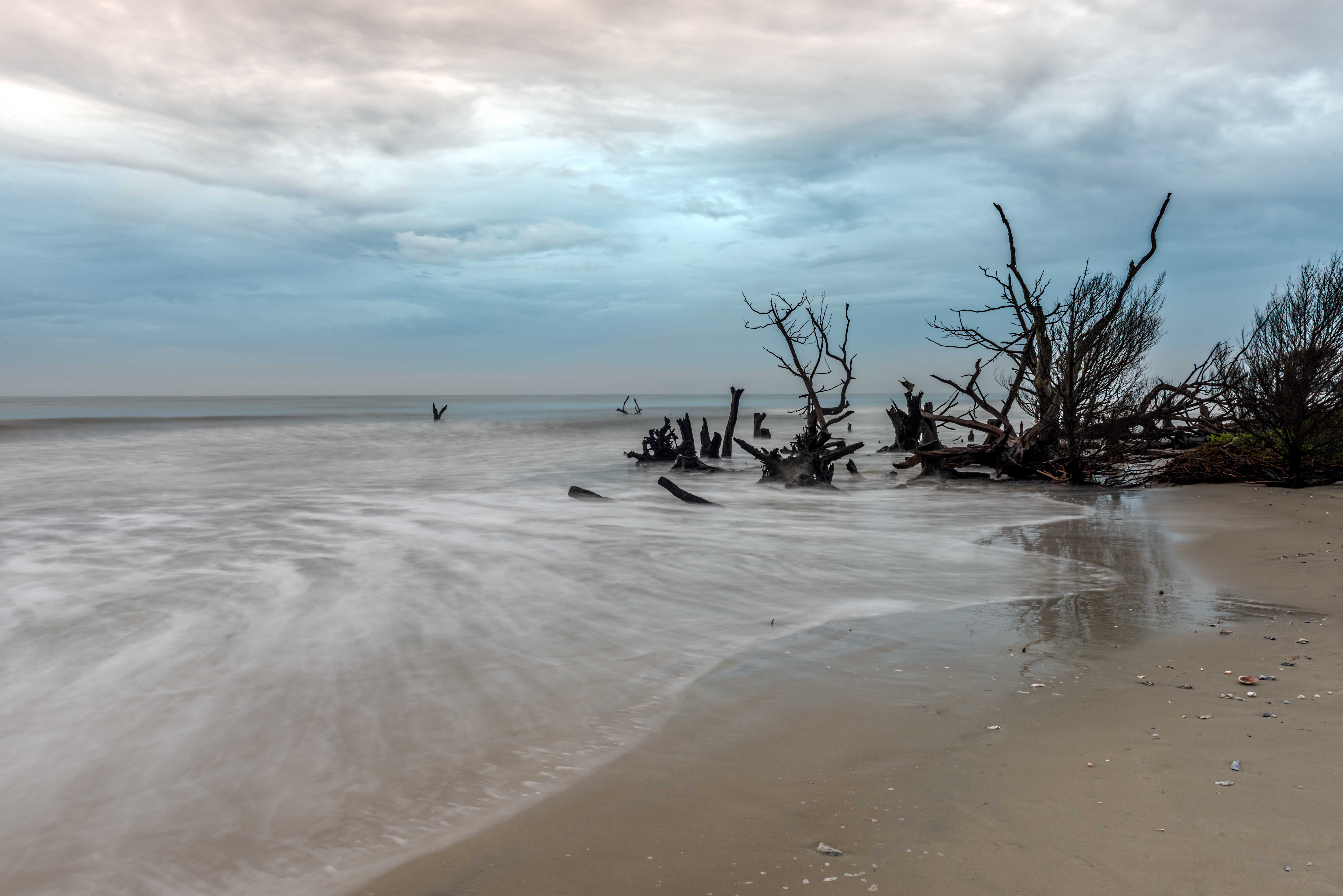 Bulls Island is changing shape from shifting ocean currents and waves, and the shoreline is moving inland, leaving the trees behind on the beach and in the water. The saltwater kills the trees, and over time the sun bleaches their dead bark and branches, hence the name “Boneyard Beach.” I photographed a similar boneyard beach in northern Florida on Little Talbot Island, but the boneyard on Bulls Island extends over a much longer distance, providing many more photography opportunities.