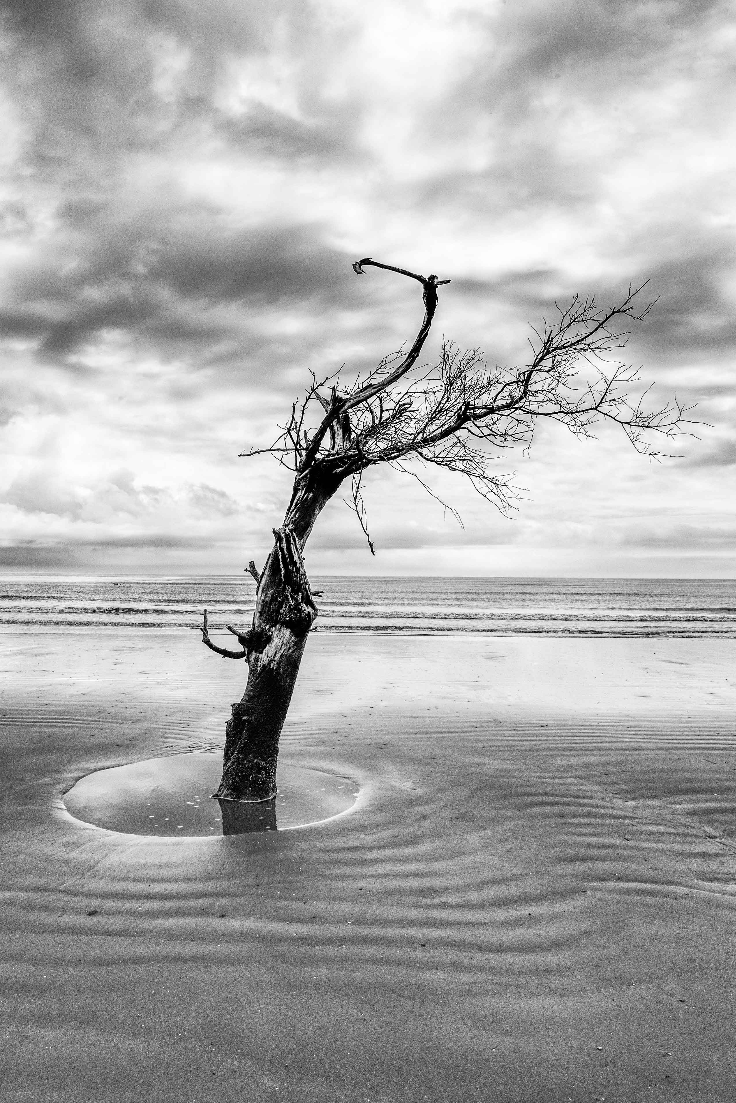 Obviously different than the other images, the below image is black and white. I do not usually shoot many black and white photographs, but sometimes they just work. This B&W image highlights the contrasting light and dark areas, the parallel lines of the ocean’s waves, and the ripples in the sand around the tidal pool at the base of the dead tree.