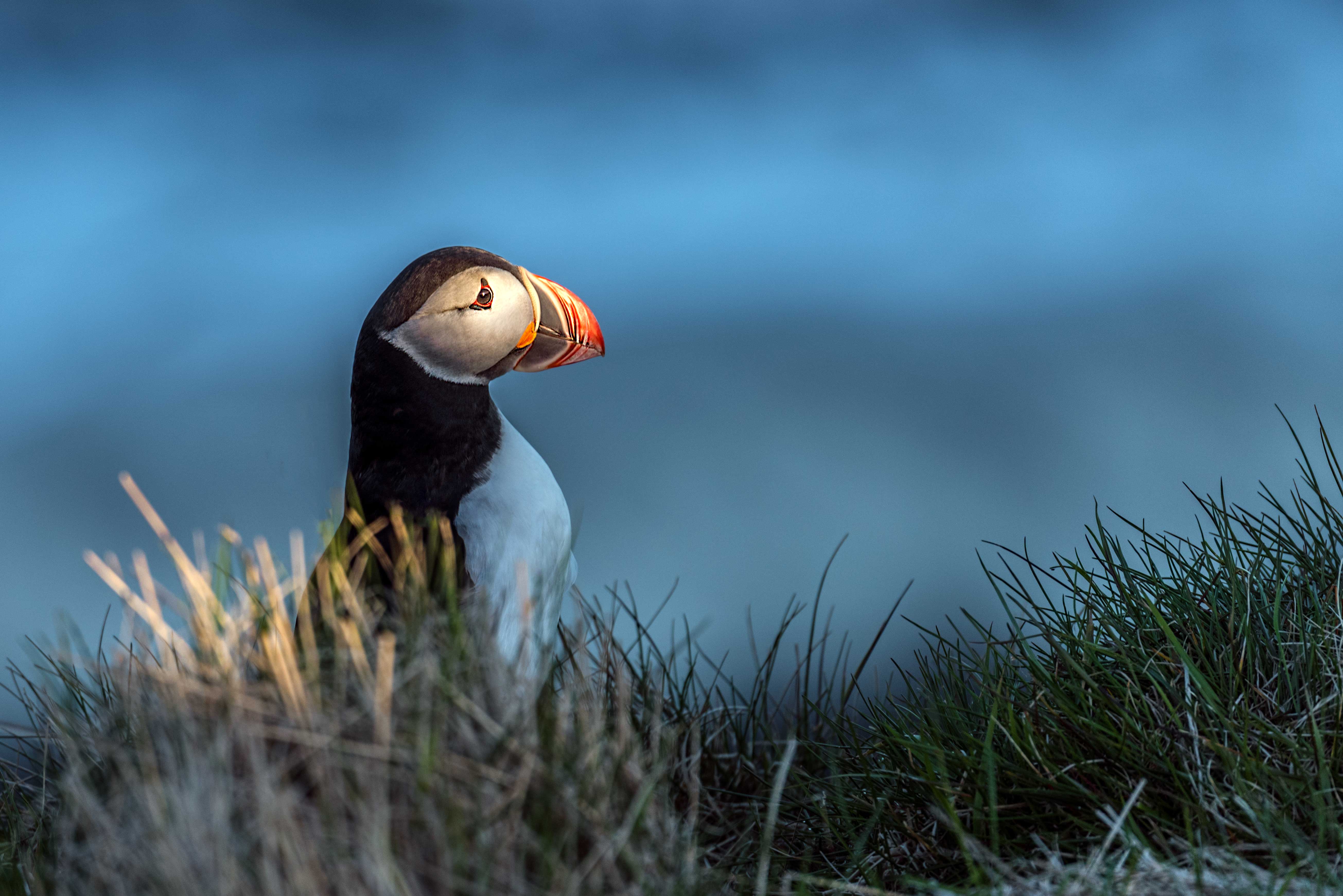 The above photograph is a 12 image panoramic taken on the last day of the trip (go full screen and click on it to see more detail), and below is an Atlantic Puffin lit by the setting sun. I was hoping the Puffins had returned from the sea to their nests so that I could see and photograph them. Well, they had!