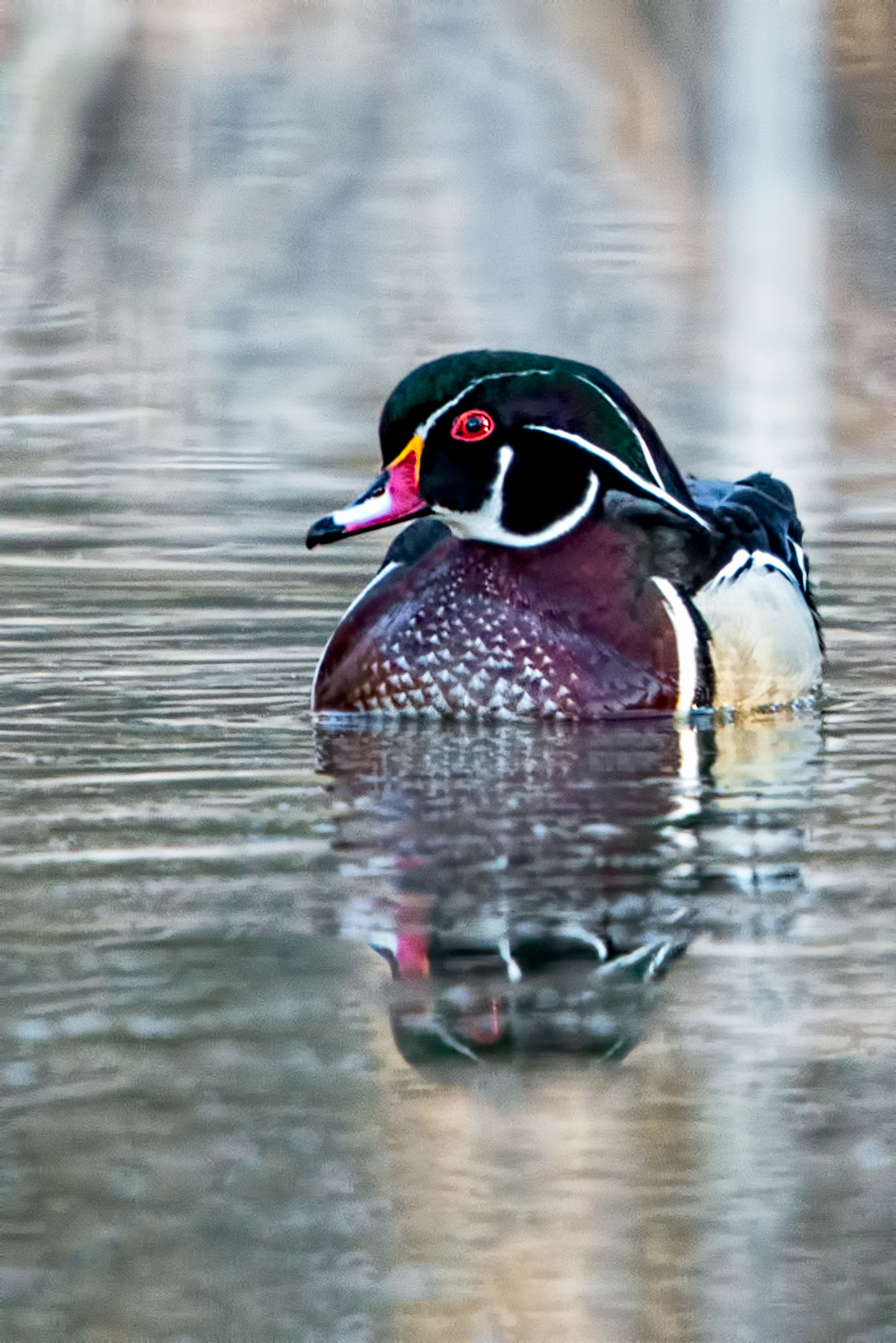 During that time, I said to a friend, Ernie Sears, who also was photographing the Wood Ducks, “wouldn’t it be incredible if we happen to be here when her ducklings emerge from the nesting box.” At the time, I did not notice the egg shell attached to her chest (below image). On a previous visit to Huntley Meadows, a park volunteer said that last year a photographer spent an entire week, everyday at the same location, in order to photograph the ducklings as they dropped from the nesting box. I never thought we would be so lucky.