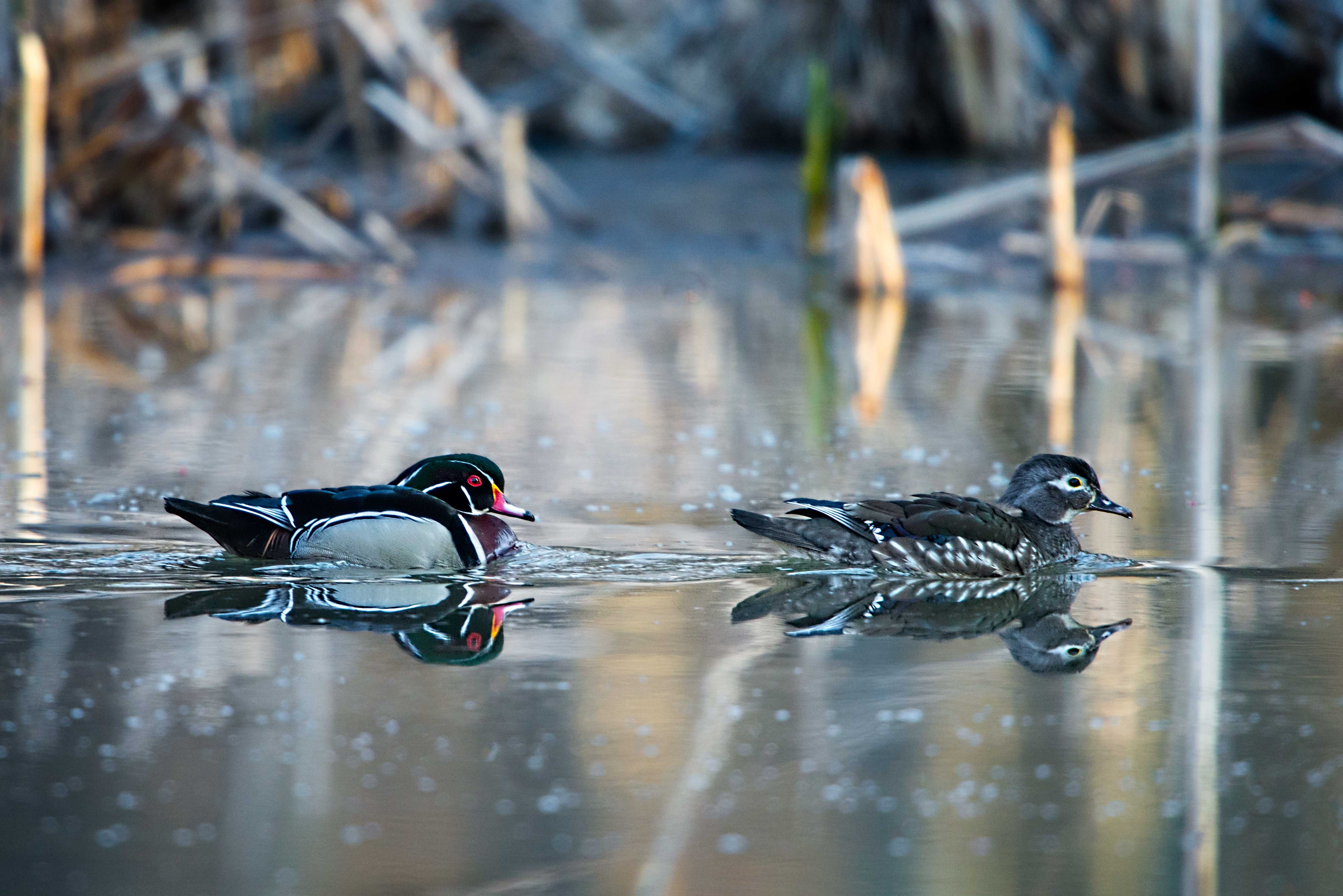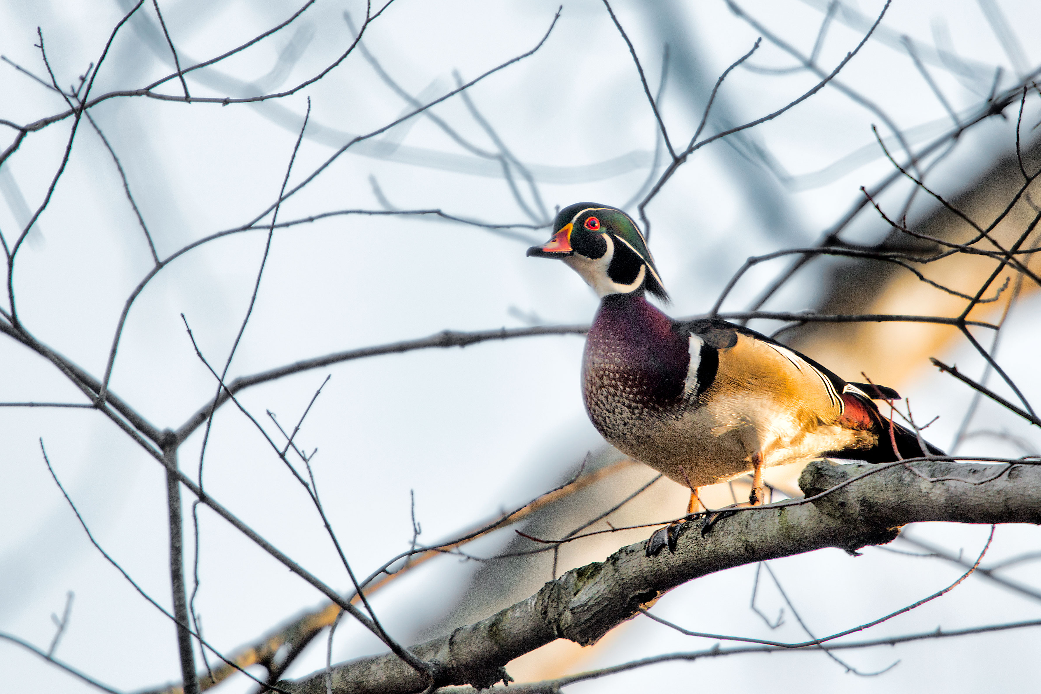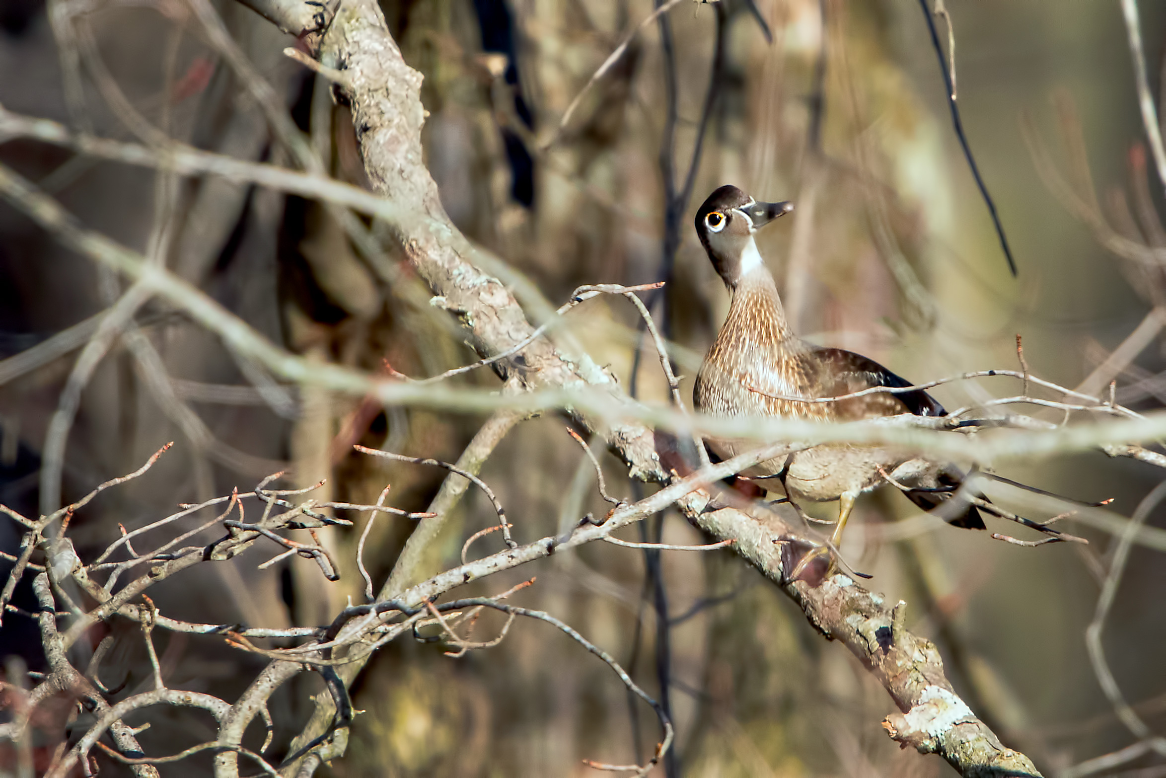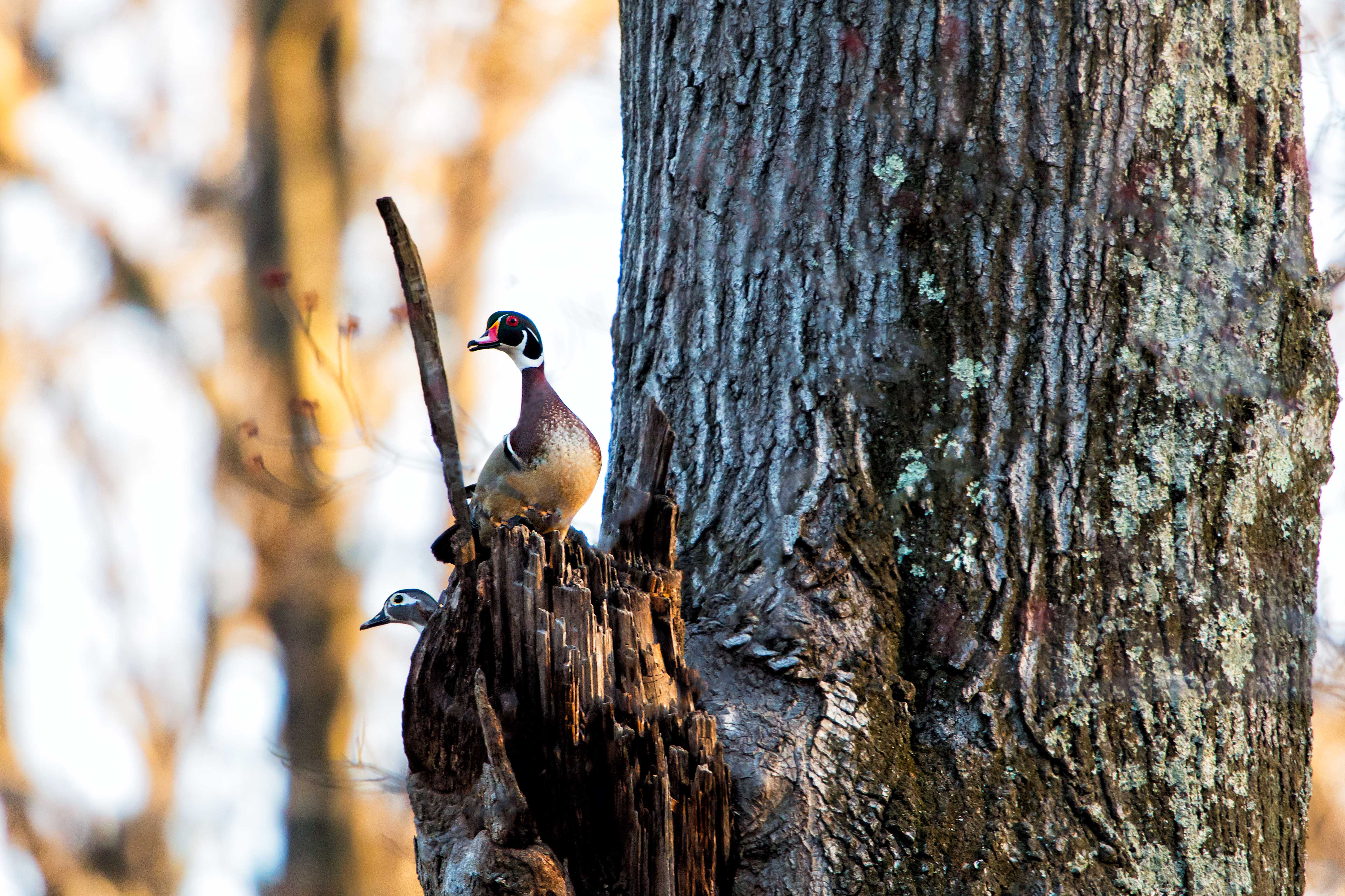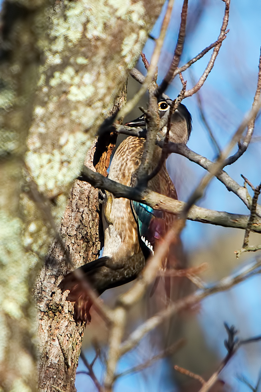 As you can see by the above images, the drake Hooded Merganser was not around, which is typical. When the hen begins sitting on the nest, after laying her eggs over a couple of weeks, the male departs. Hooded Mergansers nest in tree cavities (and nest boxes), and can lay up to 13 eggs in a clutch. At times, more than one hen merganser will lay eggs in the same nest–this is known as dumping, but only one hen will sit on the eggs until they hatch. A Hooded Merganser nest was once found with 44 eggs in it.